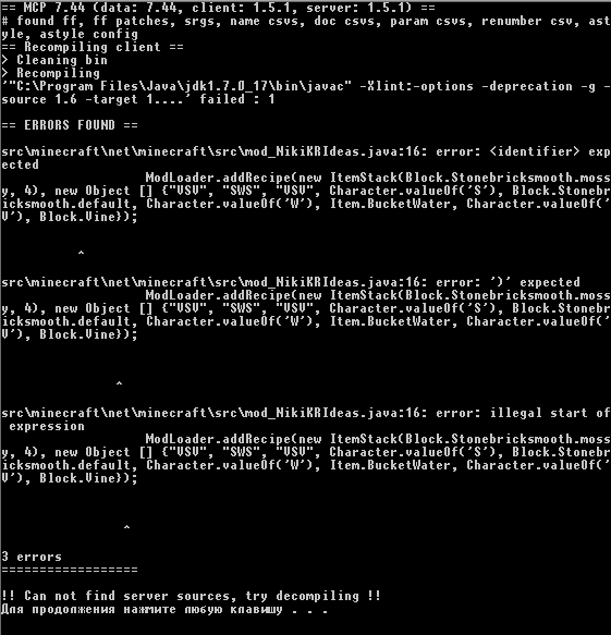 # found ff, ff patches, srgs, name csvs, doc csvs, param csvs, renumber csv, ast yle, astyle config == Recompiling client == > Cleaning bin > Recompiling '"C:\Program Files\Java\jdk1.7.0_21\bin\javac" -Xlint:-options -deprecation -g - source 1.6 -target 1....' failed : 1 == ERRORS FOUND == src\minecraft\net\minecraft\src\mod_dlocked.java:10: error: method addSmelting i n class ModLoader cannot be applied to given types;ModLoader.addSmelting (Block.blockGold, new ItemStack( Item.ingotGold, 10), 1.1F); ; required: int,ItemStack,float found: Block,ItemStack,float reason: actual argument Block cannot be converted to int by method invocation conversion 1 error ================== !! Can not find server sources, try decompiling !! Для продолжения нажмите любую клавишу . . .