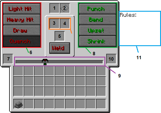 - Полагаю, в таком случае самое время провести небольшой эксперимент, не так ли? Если нет возражений, я могу, для начала, заменить изображения булыжников на анимированные в шаблонах для работы по камню. Если всё пройдет успешно — дальше можно будет сделать анимированные изображения для досок и других изделий из дерева. Что касается инструментов, то, думаю, пока их заменять не стоит. Единственное исключение — молот, который всегда должен находится в слоте 7 наковальни (см. рисунок ниже). Его анимированное изображение уже есть, и его, полагаю, стоит жестко зашить в шаблон. — U.N.Owen 23:31, 27 декабря 2012 (UTC)