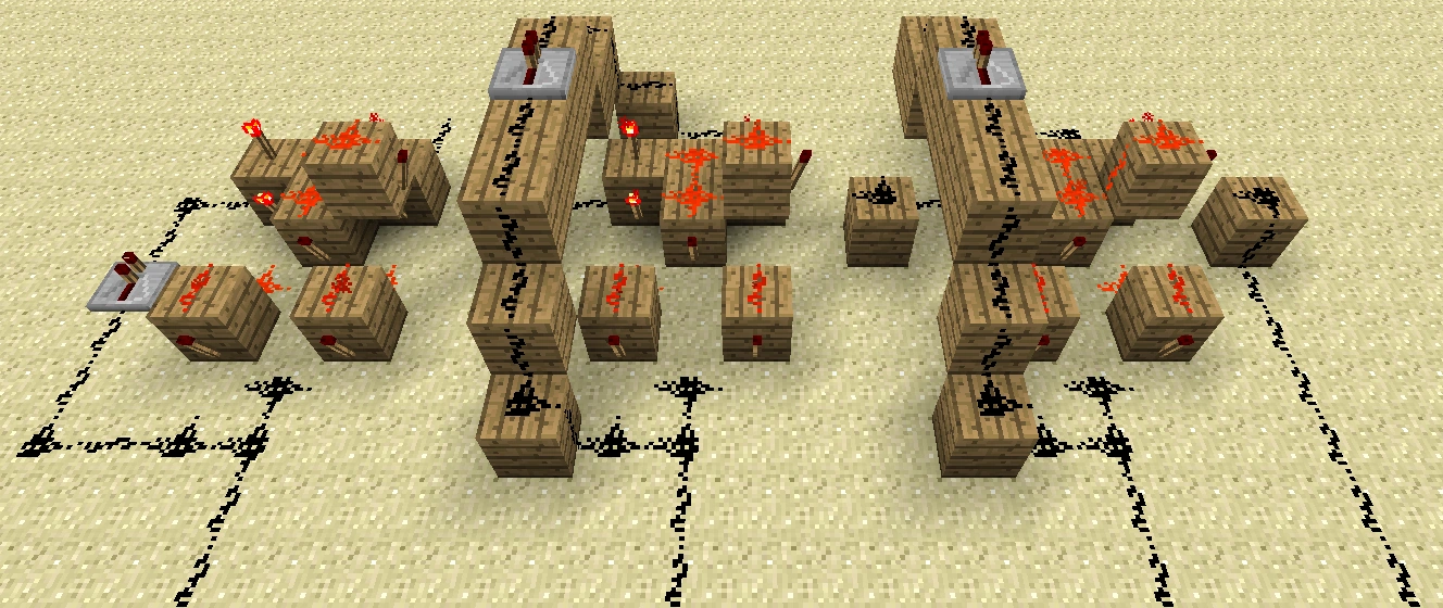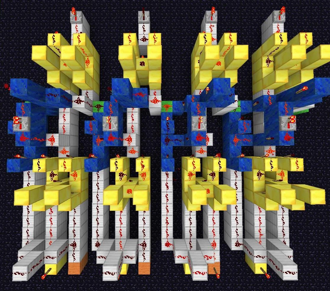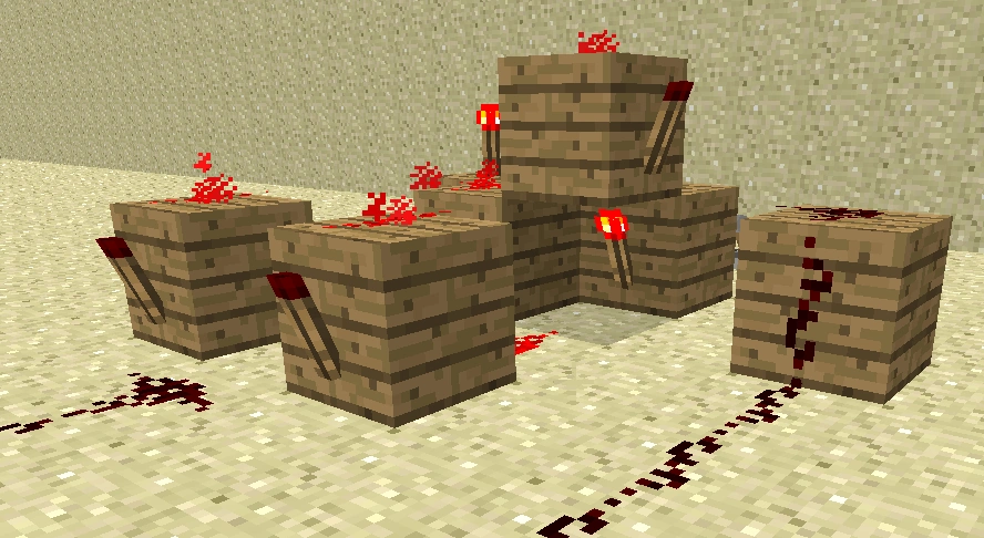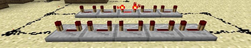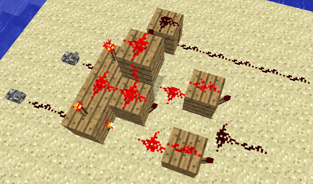 Данный механизм может использоваться во многих строениях, будь то посадочная полоса аэропорта, вывеска магазинчика на вашем любимом SMP сервере, станция метро. Даже ваше эпичное строение будет по особому выделяться ночью переливанием красных факелов. Факелы будут по очереди зажигаться «волной». Схема простейшая и основана на повторителях и тактовых генераторах. Приступаем к монтажу.