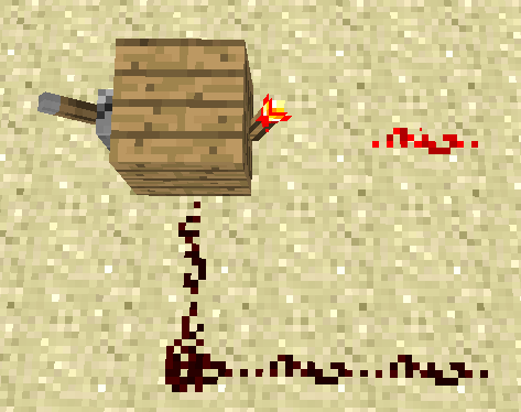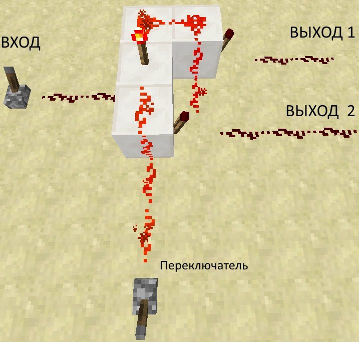 Простой переключатель[]Собственно ничего сложного. Рычаг либо включает факел и выключает нижний провод, либо наоборот. A если добавить AND вентиль, то возможна блокировка. |