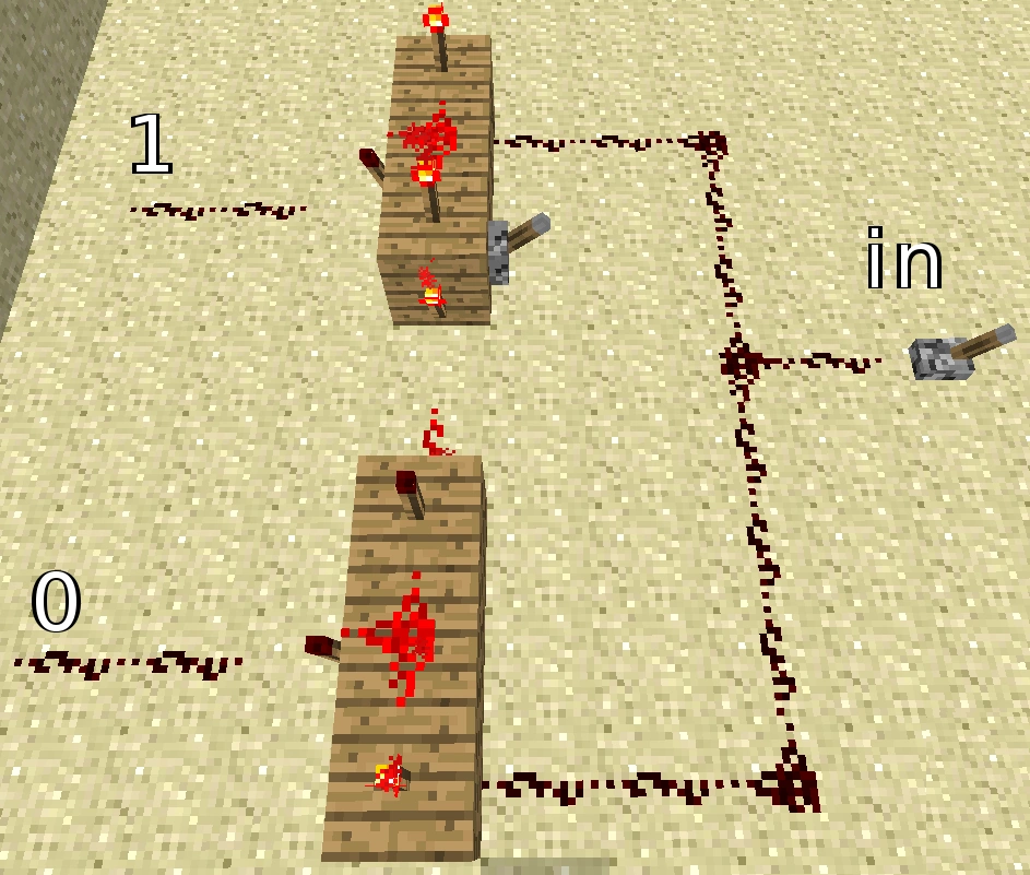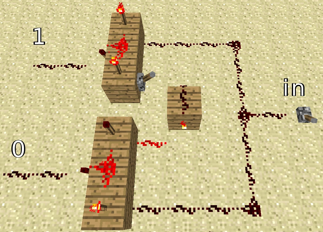 Переключатель сигнала[]Данный вид переключателей сложнее, но и технологичнее. Суть в том, что вы не просто переключаете 1 между выходами, а переключаете сигнал на входе ( in ) между выходами ( 0 и 1 ). Для примера возьмем двери шлюза. Двери открываются выходами 0 и 1 , а рычаг переключения находится между ними. Рычаг in выполняет роль «засова». Если «засов» не подает сигнал, двери не откроются. Если «засов» подает сигнал, то с помощью переключателя можно выбрать, какую из дверей открыть.