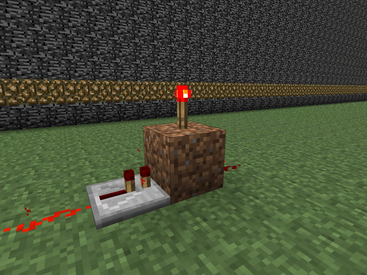 - Проводим сигнал от генератора, устанавливаем повторитель, и сразу перед ним устанавливаем любой непрозрачный блок, поверх которого ставим красный факел. Данный механизм будет служить «светодиодом» для системы.