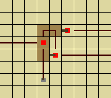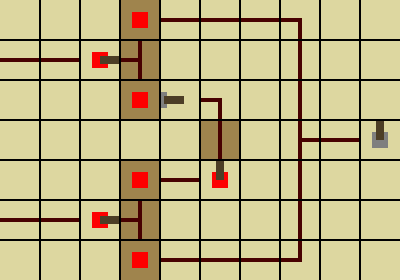 В такой схеме сигнал на выходе появляется практически сразу при подаче на вход, а исчезает спустя некоторое время после снятия входного. Каждые два повторителя представляют собой звено, которое может поддерживать сигнал до 0,4 с. Повторители, идущие в одну линию, настраиваются для достижения нужной длительности поддерживания сигнала, поперечные — в режиме минимальной задержки. Необходимо также помнить о правиле 15 клеток для выходной линии (той, что идет после поперечных повторителей).