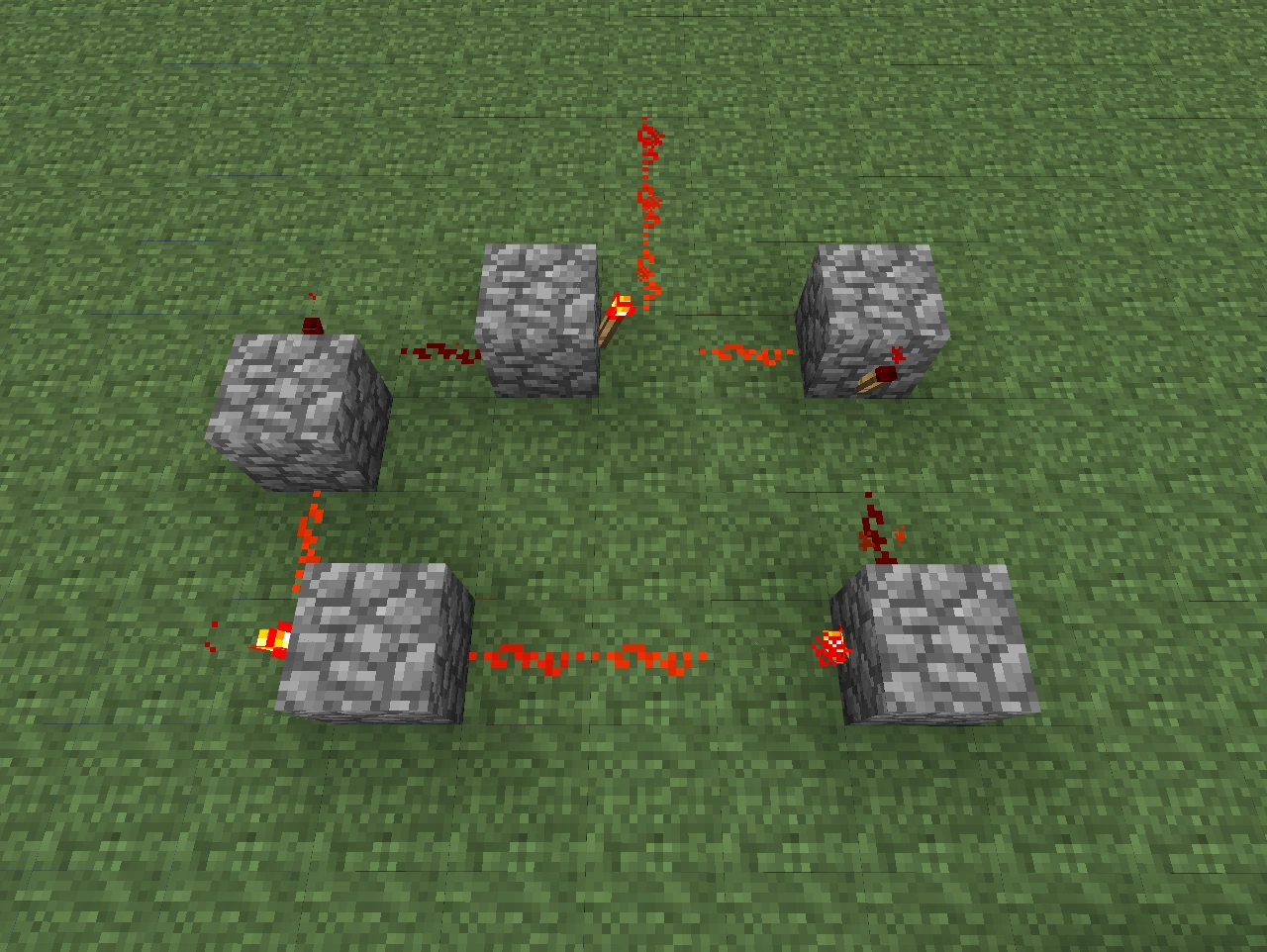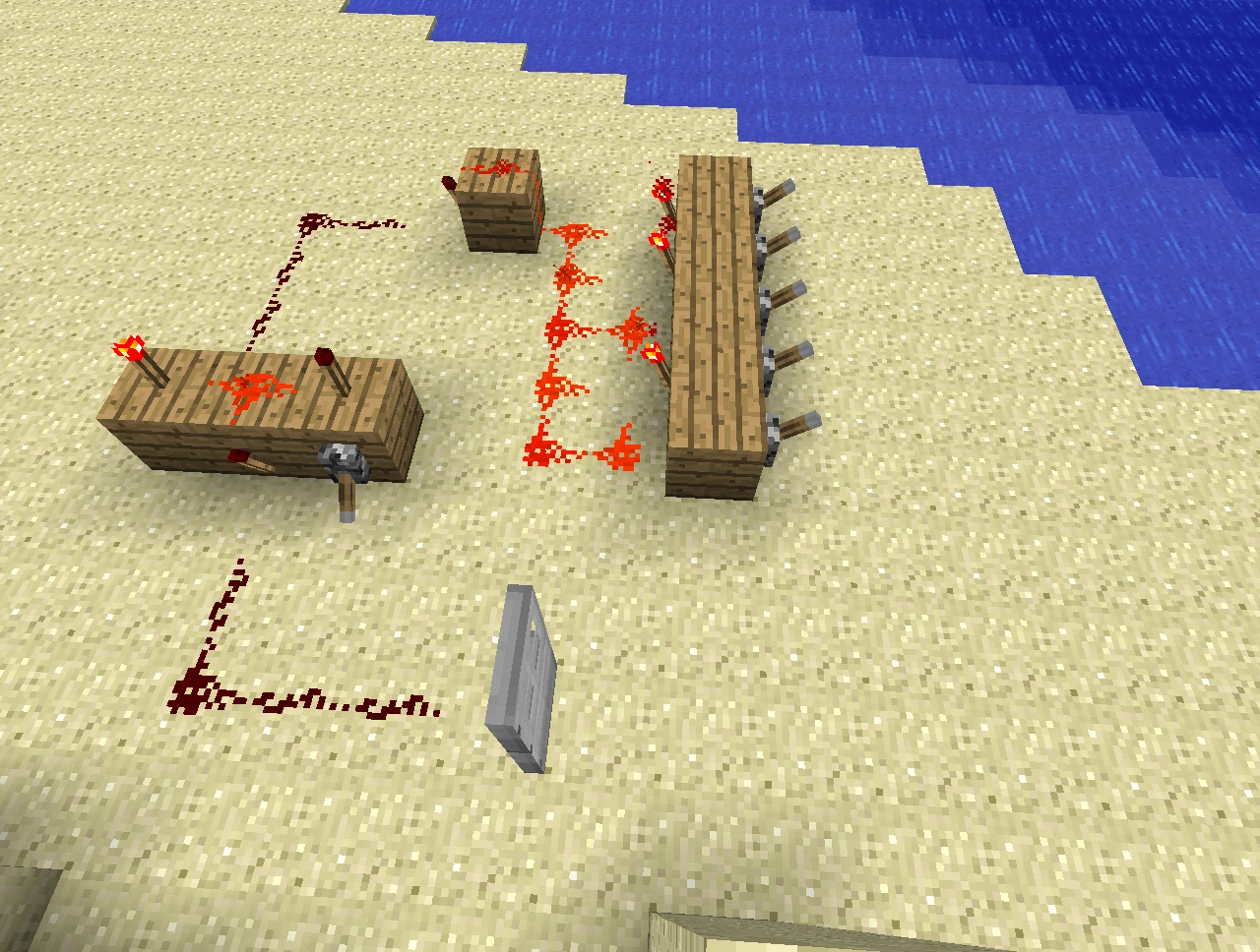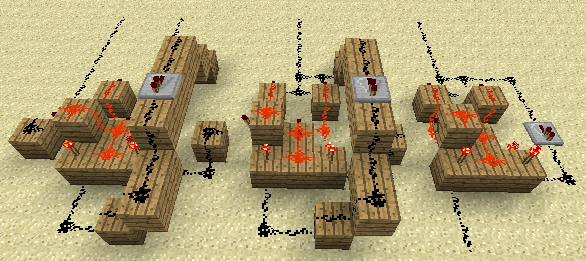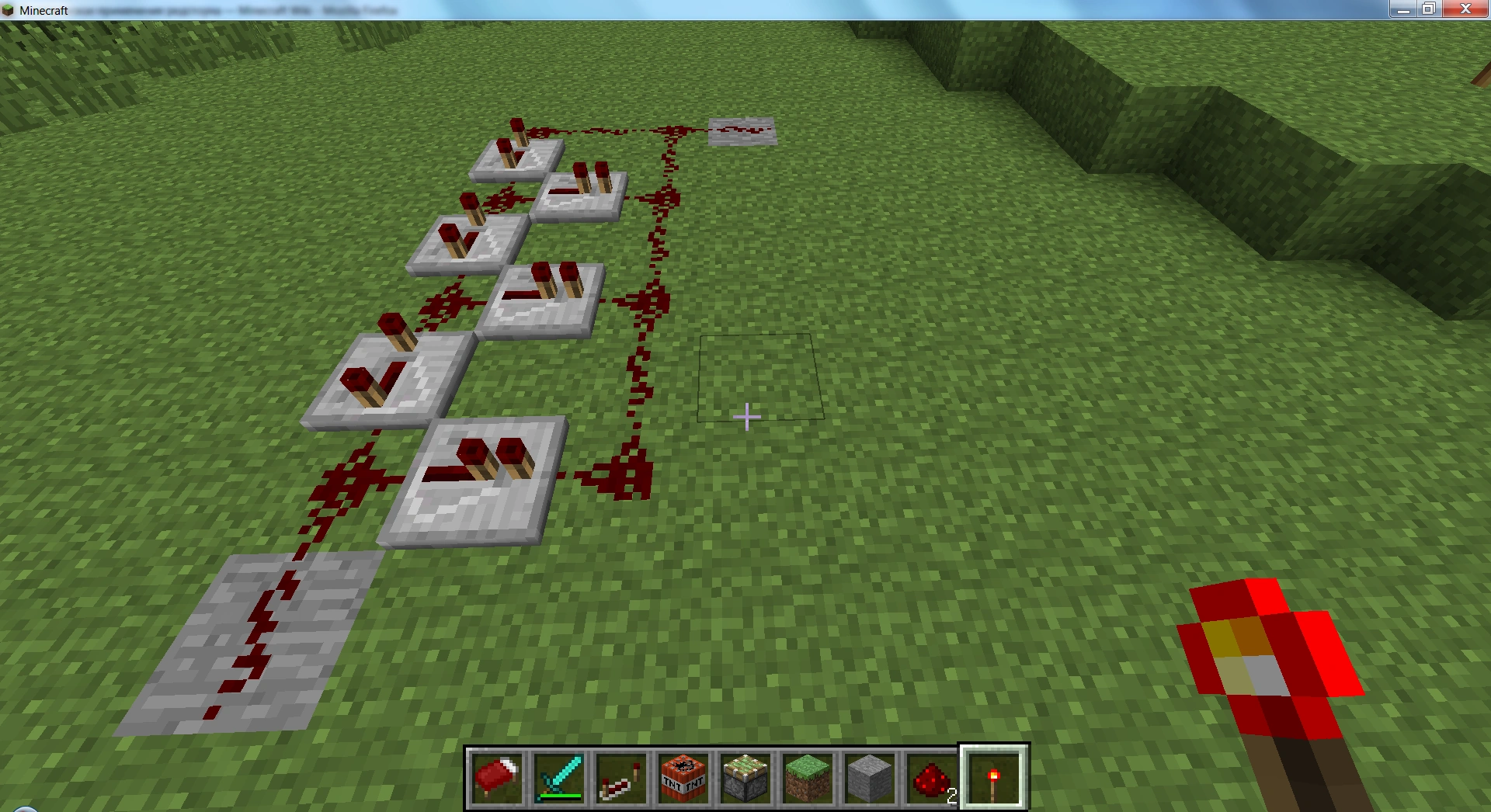 3. Обходим нашу схему с тыльной стороны и на тех блоках, где у нас установлены рычаги в нижнем положении, вешаем красные факелы. Они сразу должны потухнуть. Это будет значить, что вы поставили их верно