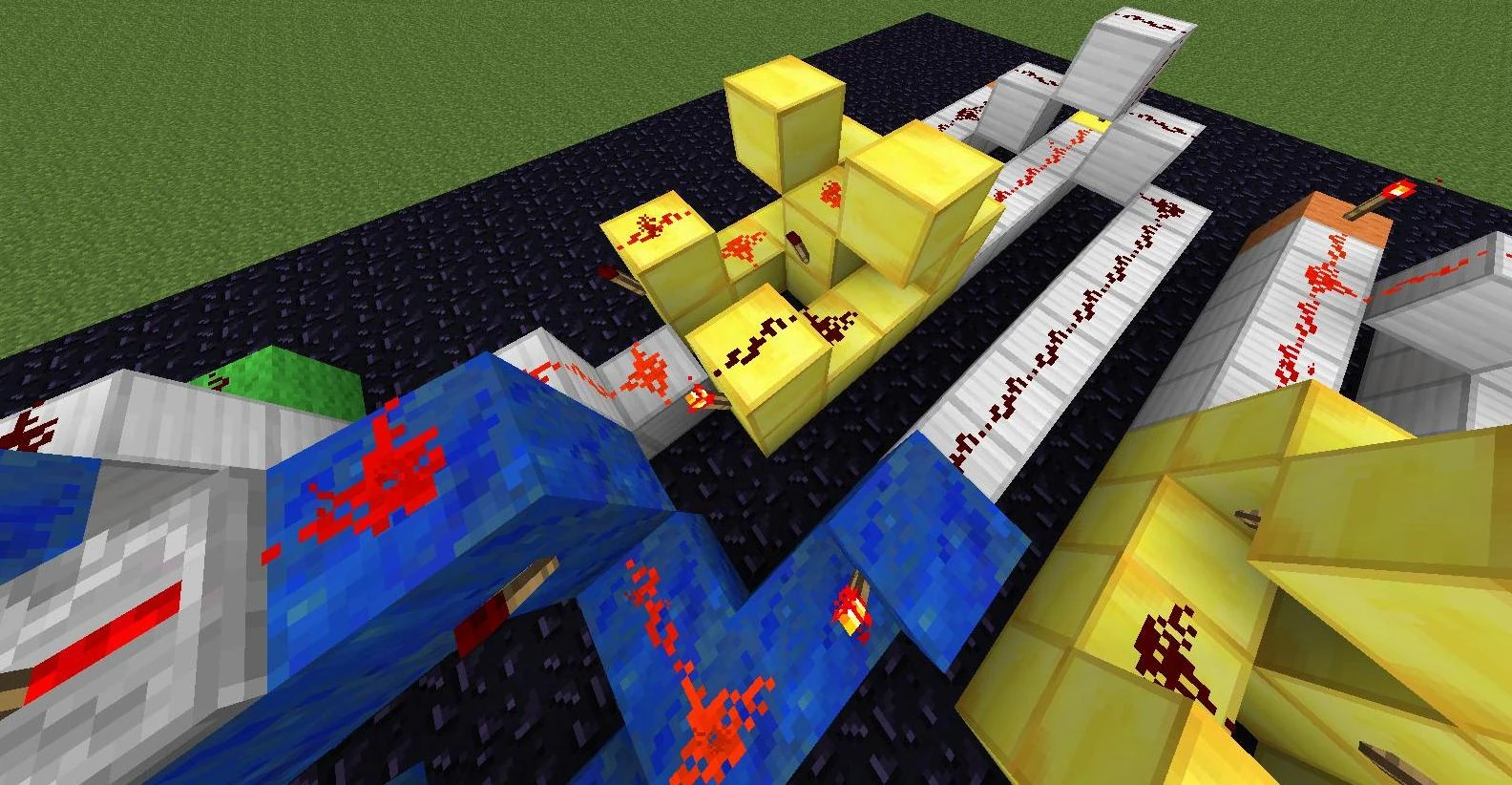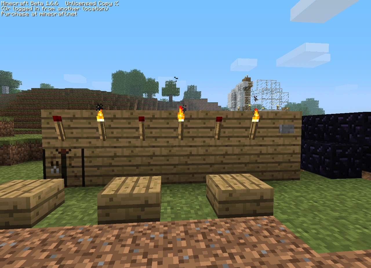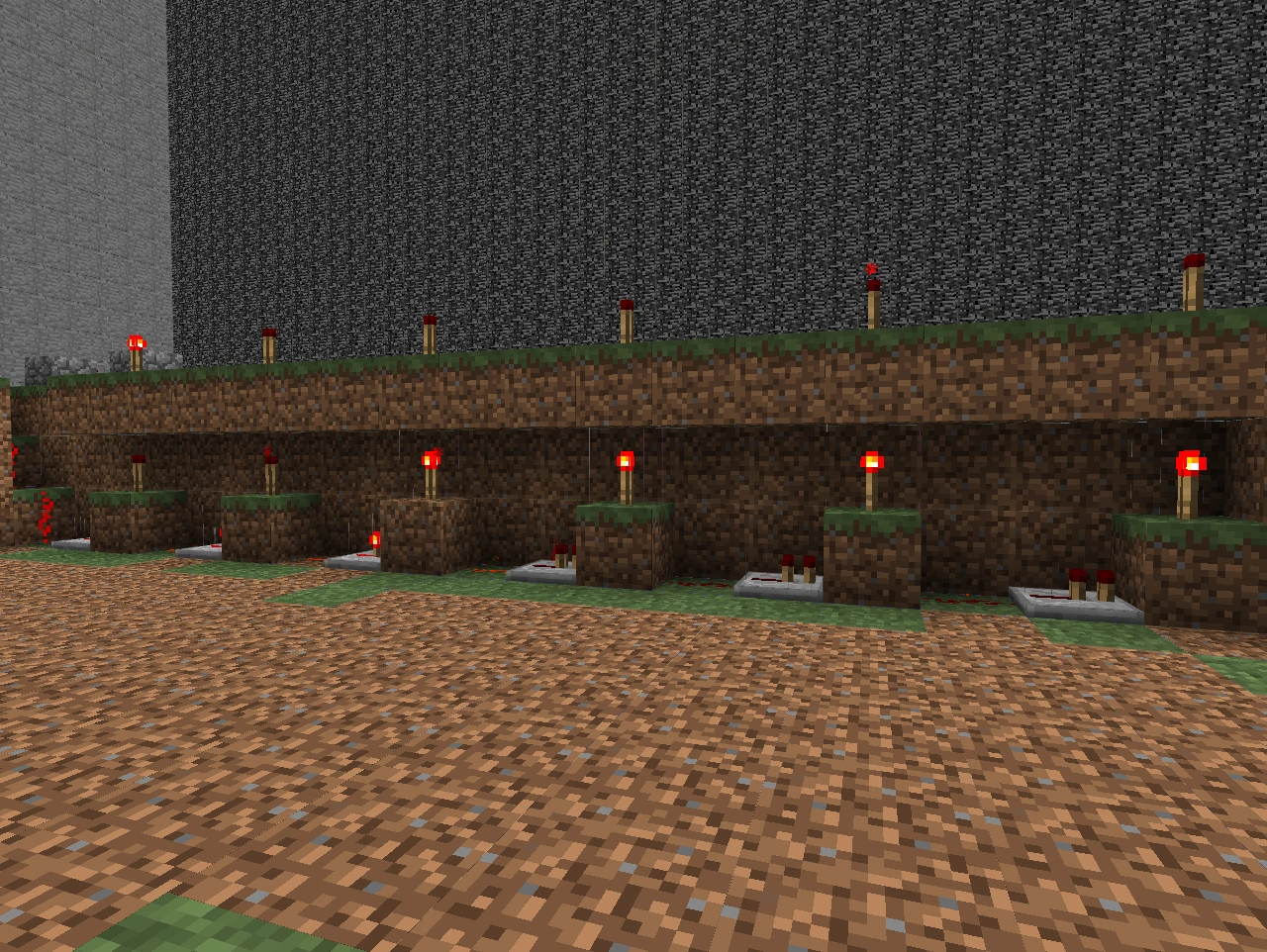 3. Обходим нашу схему с тыльной стороны и на тех блоках, где у нас установлены рычаги в нижнем положении, вешаем красные факелы. Они сразу должны потухнуть. Это будет значить, что вы поставили их верно