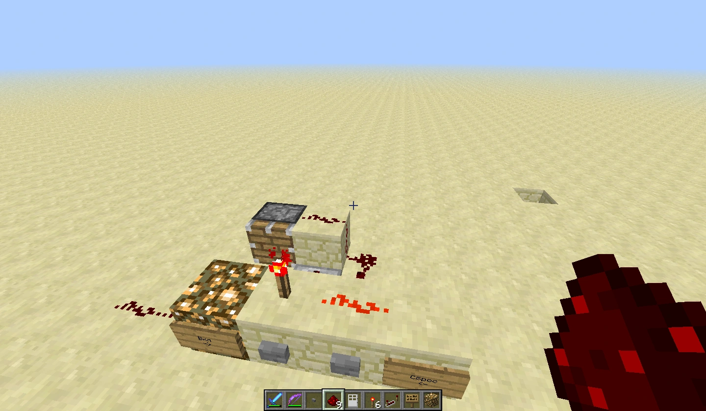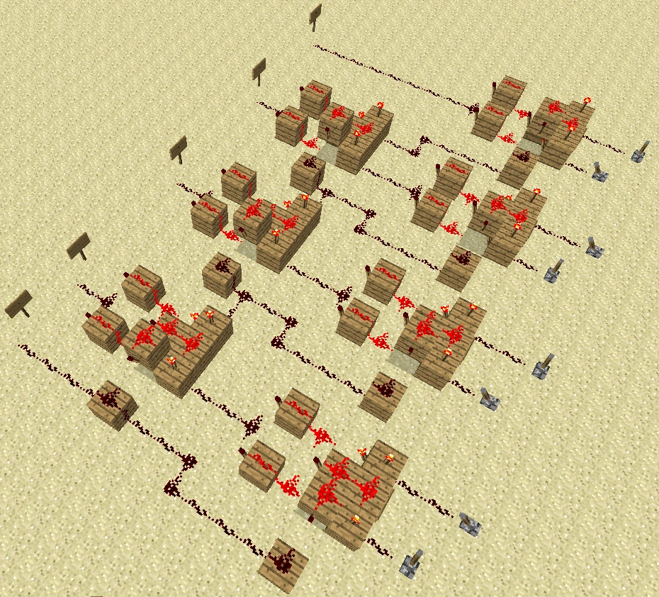 Давайте попробуем это построить! На блоках с «правильными» рычагами ставим красные факелы, неправильные же просто замыкаем напрямую к цепи. Дальше ставим инвертор и дальнейший сигнал подводим к AND Gate, на втором входе которого стоит «засов». Вот и все, ставим дверь и готово.