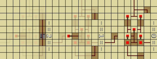Через рычаги 0 (на схеме) будет вводиться код для открытия двери (я пишу про дверь, потому что это одна из двух вещей, на которую можно взаимодействовать током). Рычаги 1 определяют какие из рычагов 0 будут «правильными». Рычаг 2 — это «засов» (если факел над «засовом» горит, то он «задвинут»). А 3 — выход идущий к двери.