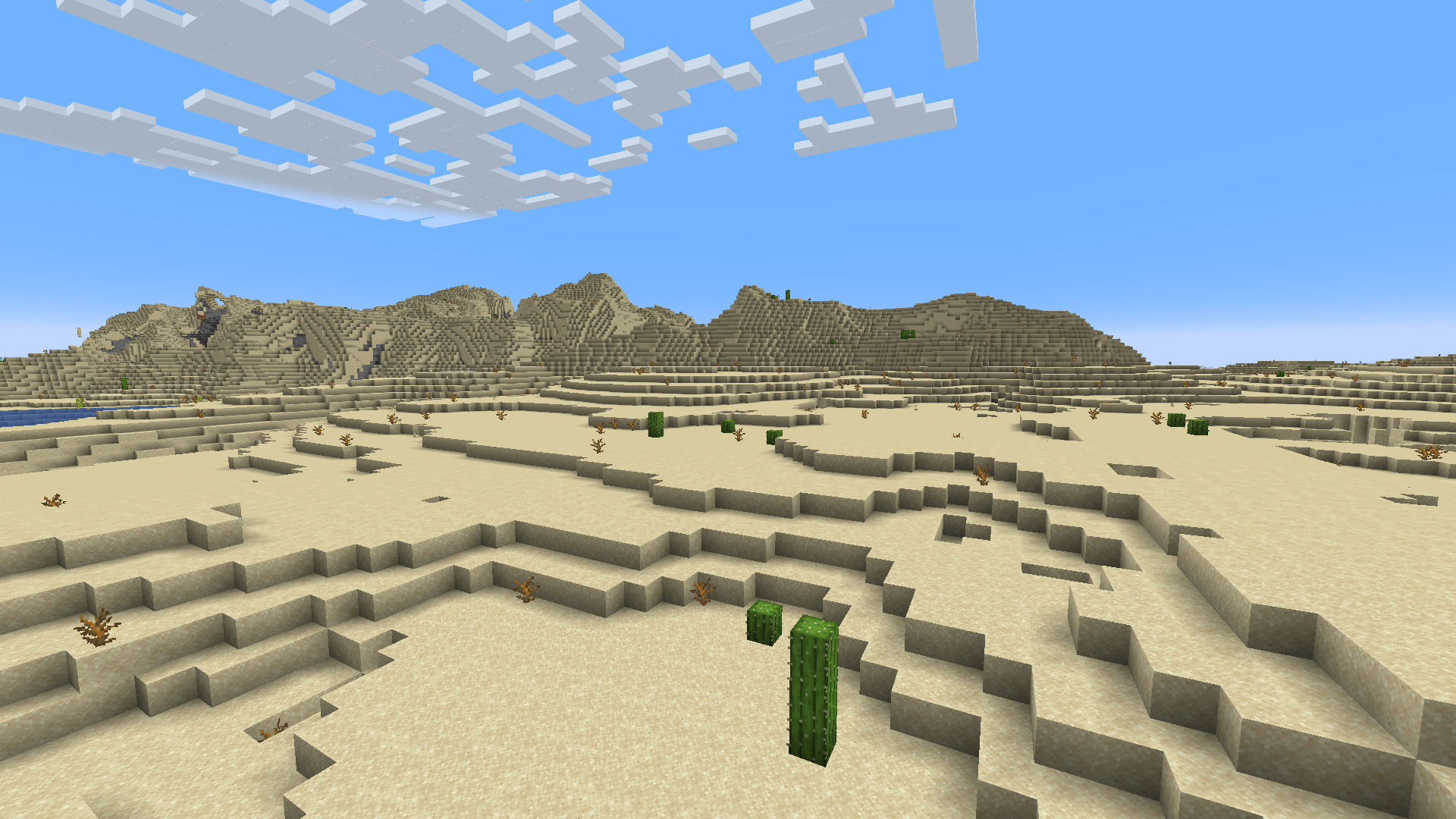 Пустыня обширная, совершенно бесплодная и безжизненная — из растений есть только кактусы и сухие кусты. Единственные дружелюбные существа, которые здесь есть — кролики. а также , которые находятся в деревнях. В деревне есть деревенские жители, также там можно найти кошек, коров, овец и свиней[заплан.: JE 1.14]. У этого биома плоский ландшафт, поверхность состоит из песка. Под песком находится песчаник для того, чтобы песок не упал в пещеру. Вода есть только в пустынных озёрах, хотя лава есть во всех типах пустыни. В пустыне нет многих полезных ресурсов, но зато есть натуральные структуры: деревни, храмы, ископаемые останки и колодцы. В деревнях и храмах можно временно пожить, также там есть ценные предметы. В деревне и колодце есть вода, которой больше нигде нет в обычной пустыне. Если сломать ископаемые останки, то можно добыть много костных блоков и костной муки.