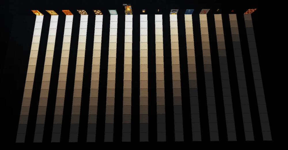 Следующие значения — это величина, на которую каждый блок уменьшает значение освещенности. Испускаемый свет уменьшается на единицу для каждого блока расстояния от источника света, больше в зависимости от блока, через который он проходит.
