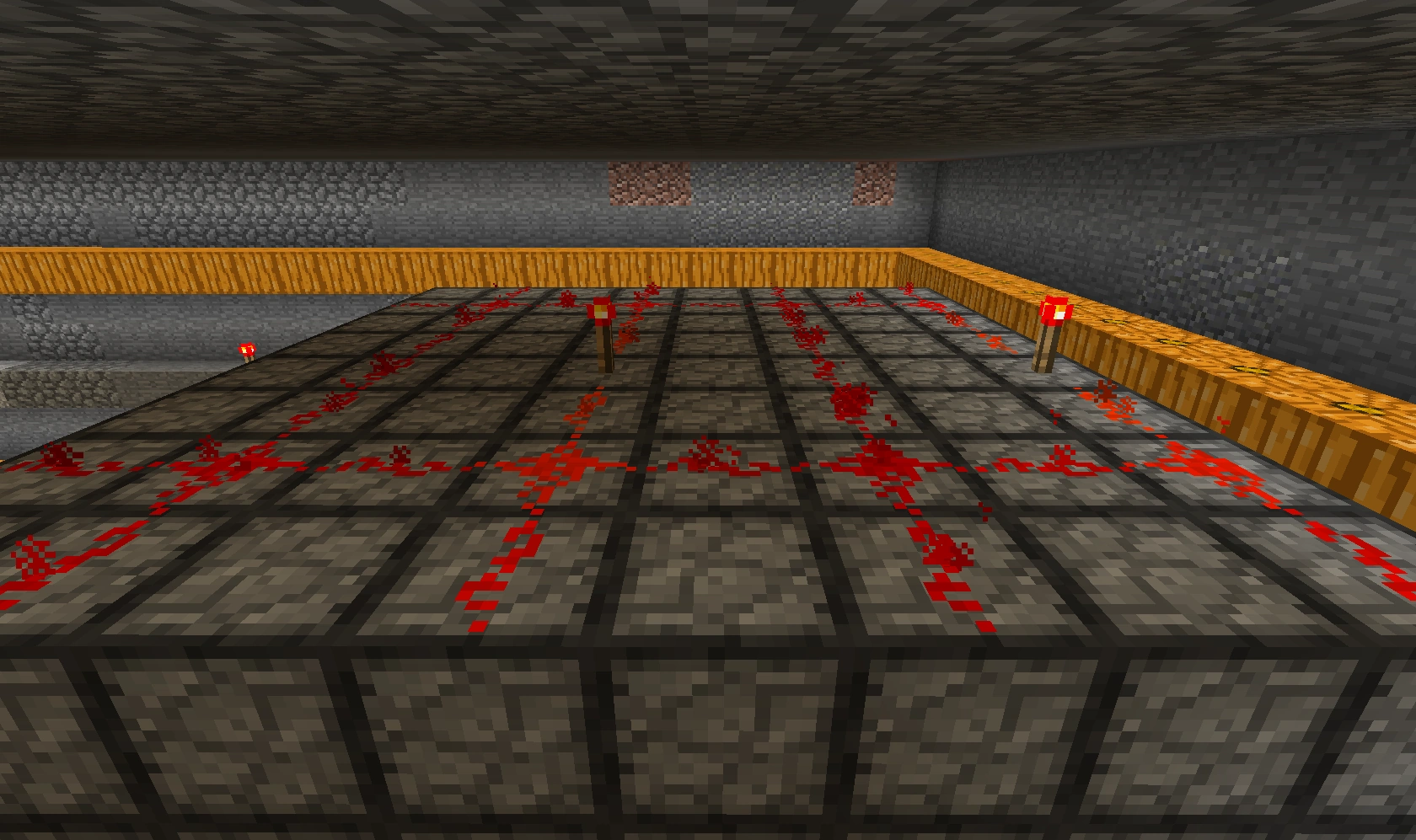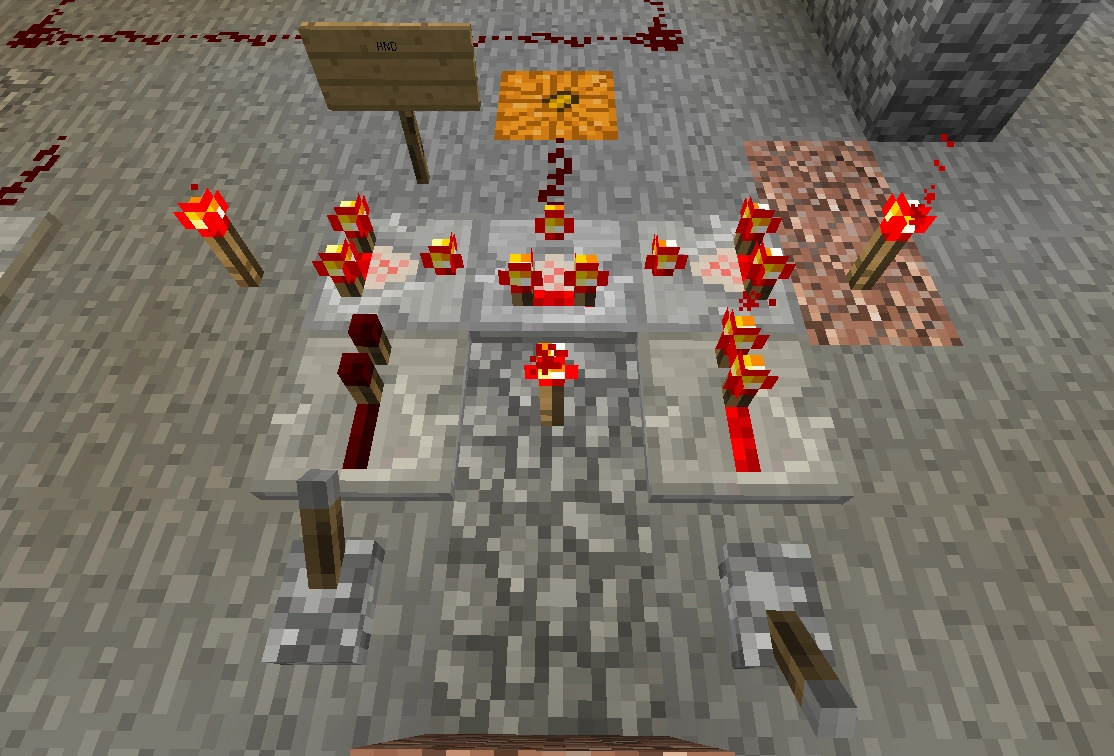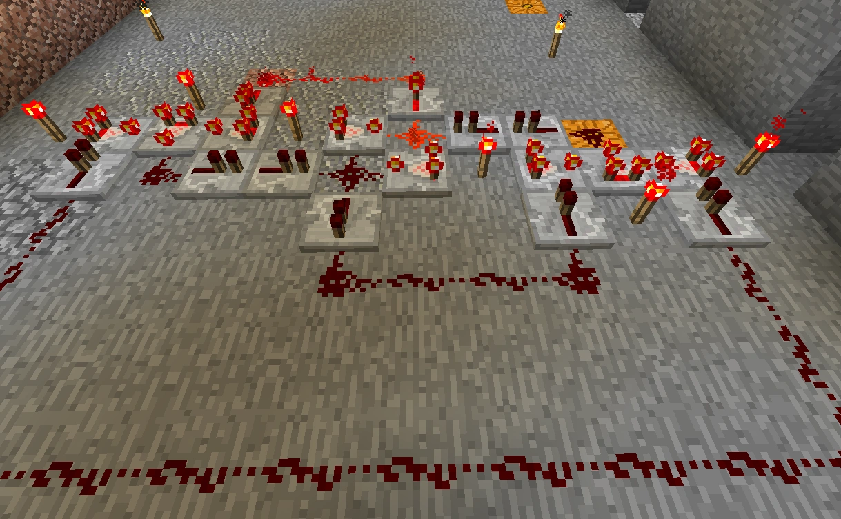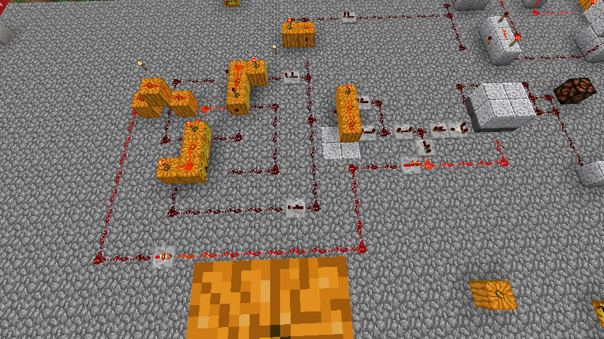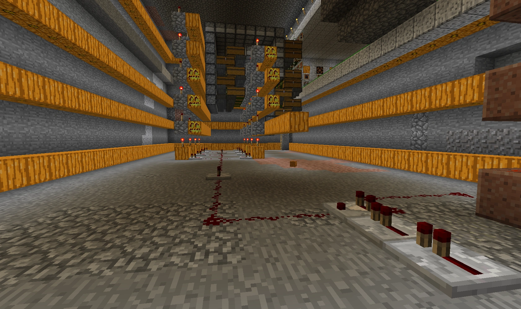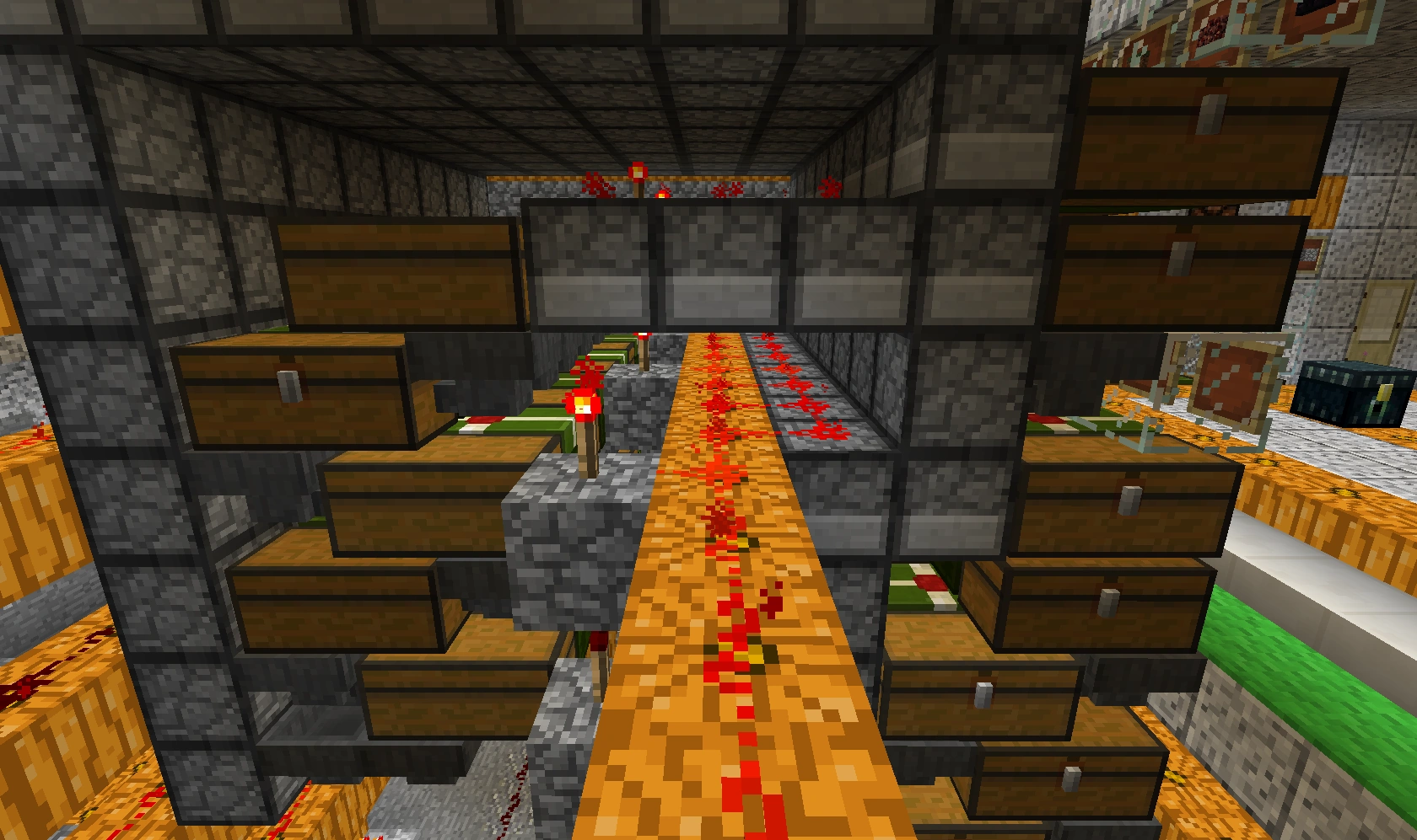 551 Кб | Общий вид на автоматическую ферму пшеницы и моркови. Слева сами фермы, справа внизу триггеры-счётчик, справа вверху - однотактный таймер |