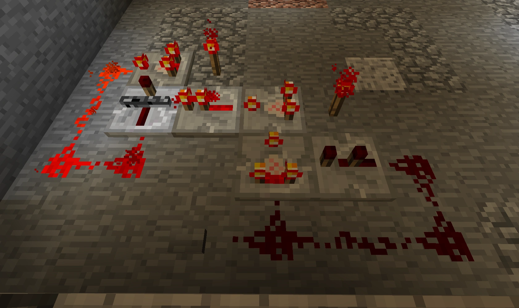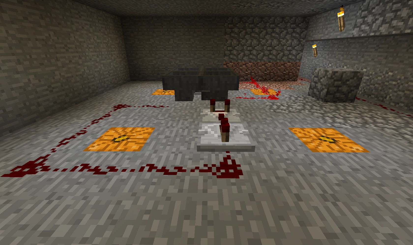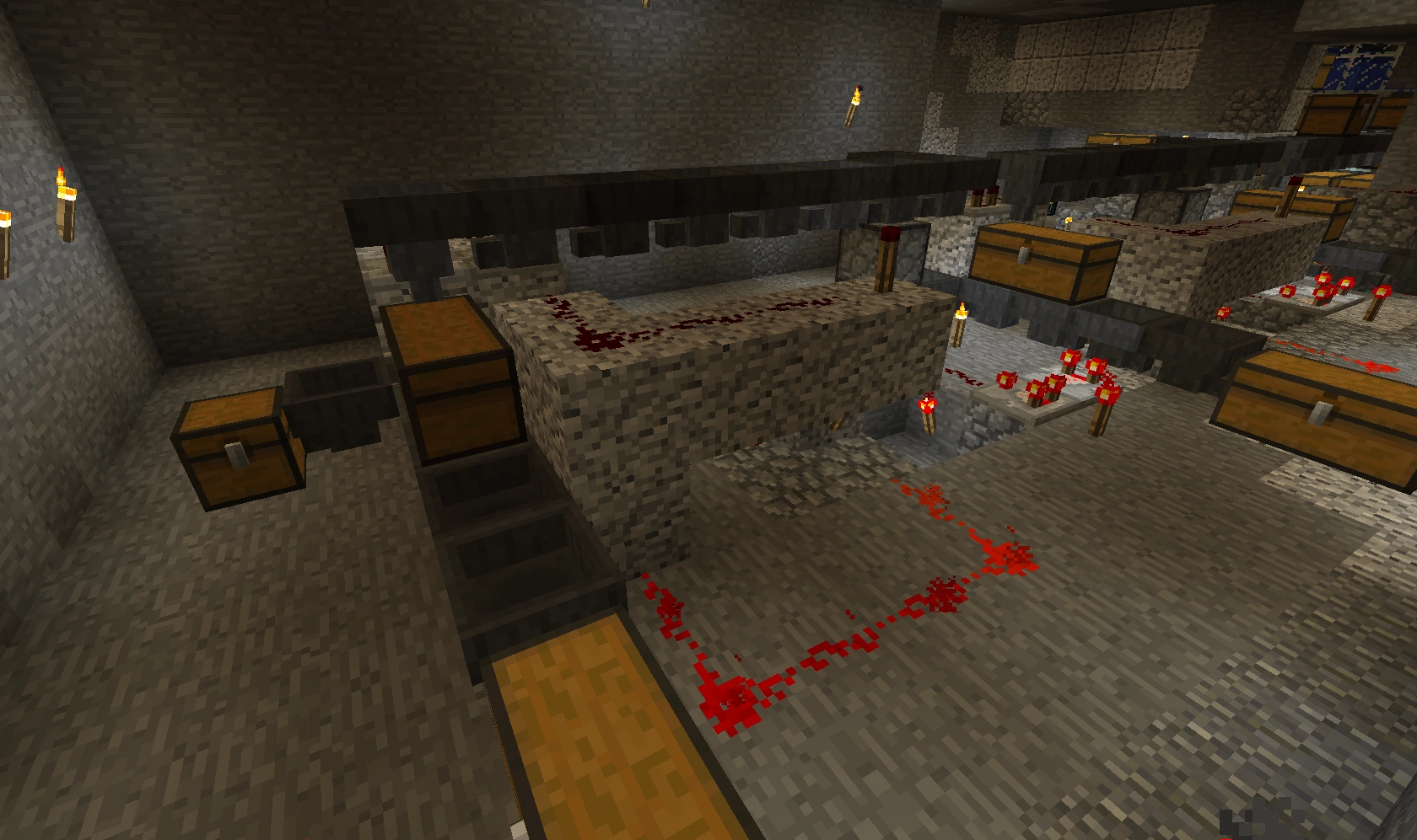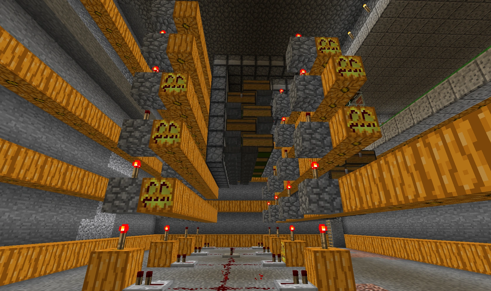 551 Кб | Общий вид на автоматическую ферму пшеницы и моркови. Слева сами фермы, справа внизу триггеры-счётчик, справа вверху - однотактный таймер |