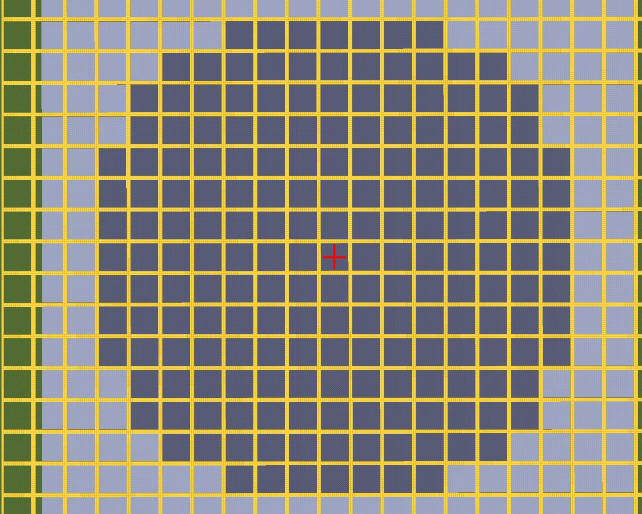 На рисунке виден радиус обновления блоков при нахождении игрока на месте красной метки. Желтым отмечены границы чанков.