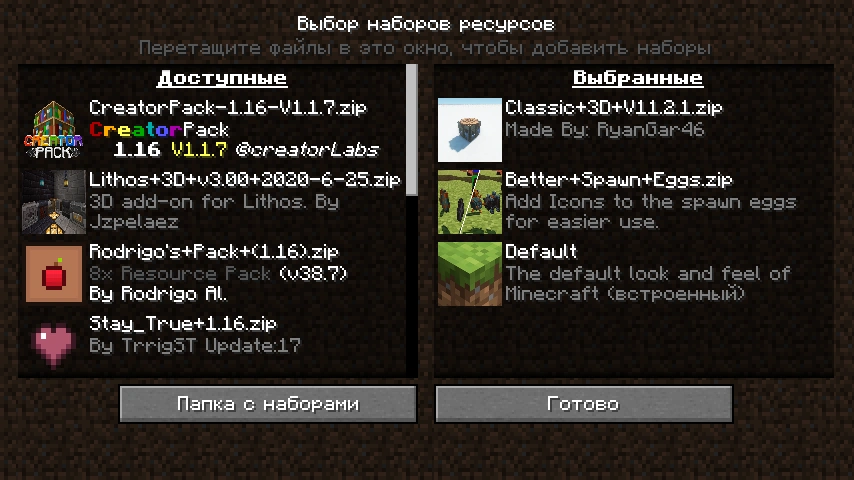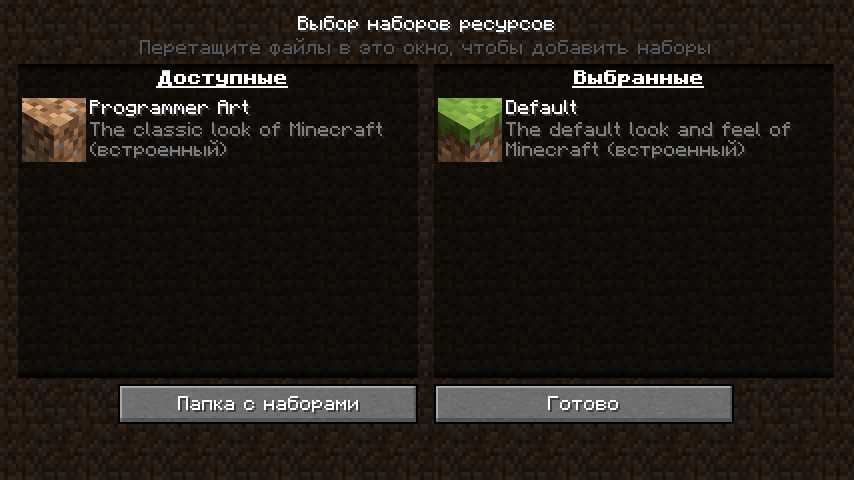 Пакеты ресурсов можно поместить в папку resourcepacks внутри папки .minecraft. Каждый пакет ресурсов представляет собой подпапку или .zip файл в папке resourcepacks. Попав в папку, пакет ресурсов можно добавить из настроек, где пакеты ресурсов можно перемещать между «Доступными» и «Выбранными». Раздел «Выбранные» по умолчанию в низу содержит Default набор ресурсов, который нельзя удалить.
