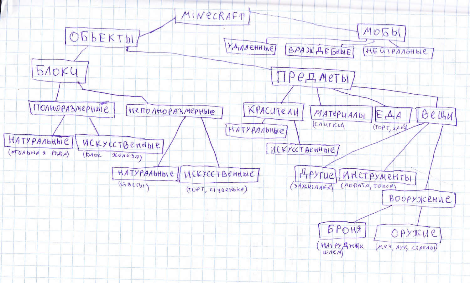 Я думаю, что статьи тут вовсе не причем. Эта схема относится только к миру игры, она не связанна со статьями и пр. Если не создавать категории "вещи", то как тогда с предметами? Разве, что заменить термин "вещи" на "другое". Идеи? Лично я полностью согласен с тем, что разделение "вещей" на подкатегории лишнее. По поводу схемы Depal’а. Мне она нравится больше, предлагаю теперь рассматривать её как приоритетный вариант. Но, есть некоторые замечания, которые хотелось бы обсудить. Мне кажется ветку "Статьи" можно совсем убрать, тогда основным (первоначальным) элементом схемы будет «Объекты» которые, делятся на "блоки", "мобы" и "предметы".--R0B 23:25, 19 января 2011 (MSK) P.S. К мобам еще можно добавить категорию «Удалённые». --R0B 00:12, 20 января 2011 (MSK)