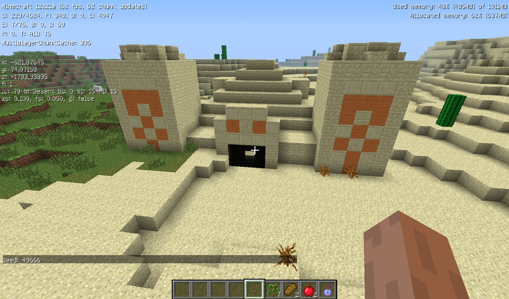 - Храмы всегда генерируются на альтитуде 65, поэтому часто могут быть частично или полностью засыпаны песком (см. скриншот).