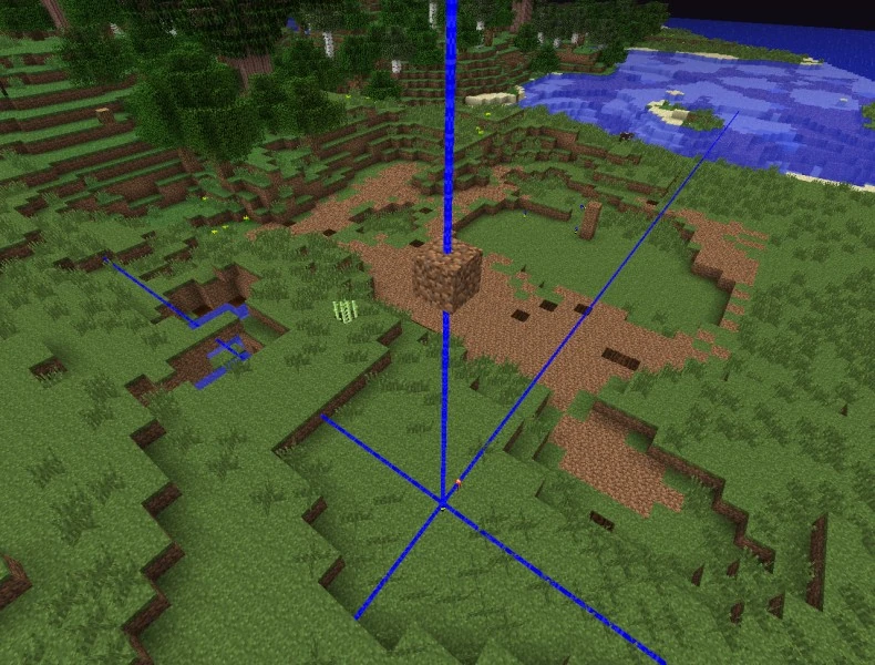 Если вам нужно разметить большую территорию, то можно использовать следующее. Поставьте красный факел или любой другой источник красного камня рядом с первой меткой, и она начнет «излучать» синие лучи во все 6 сторон. Теперь установить остальные метки на одной линии будет проще. Дальность установки ограничивается дальностью свечения синих лучей и составляет 64 блока. |