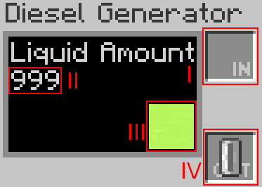 - Индикатор количества топлива. Одна ёмкость — 1000 единиц. Загруженные ёмкости не используются, если количество топлива больше 0, при этом они будут использованы, как только закончится топливо из предыдущей ёмкости. Если генератор не подключён к устройству, способному принимать электроэнергию, топливо сжигаться не будет.