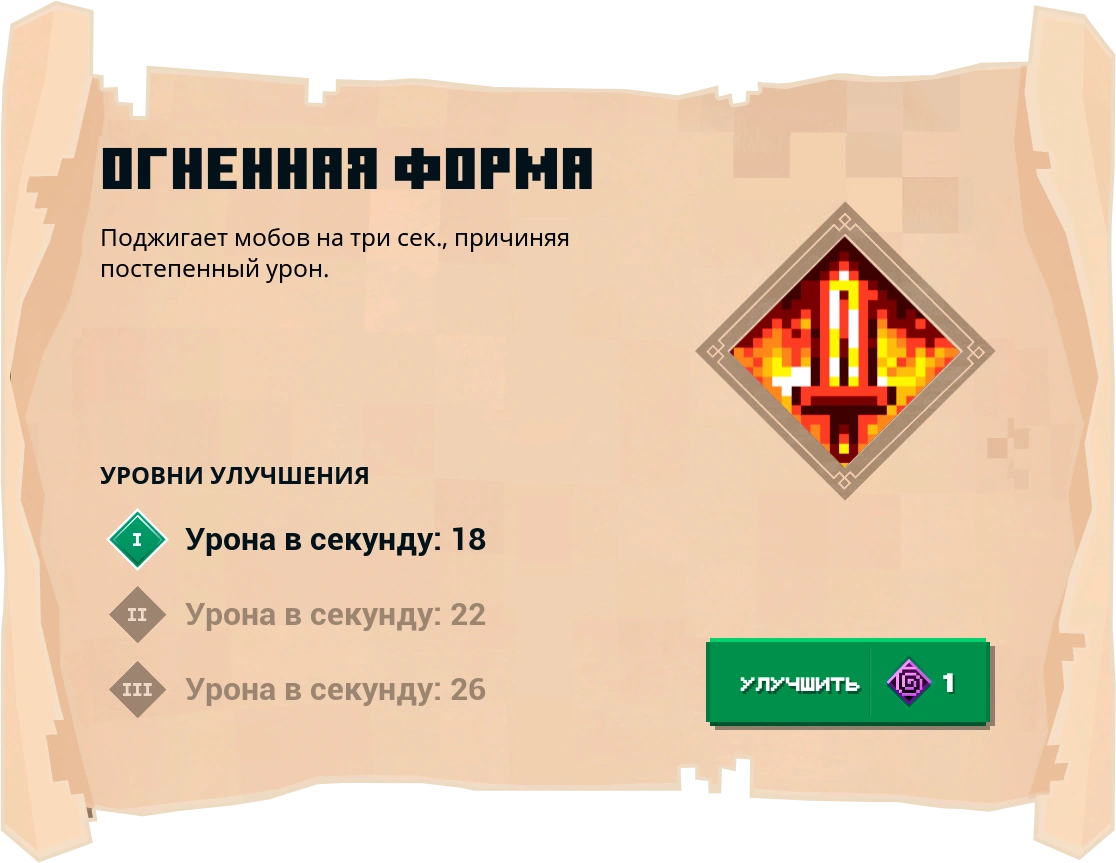 Поджигает мобов на три секунды, причиняя постепенный урон.