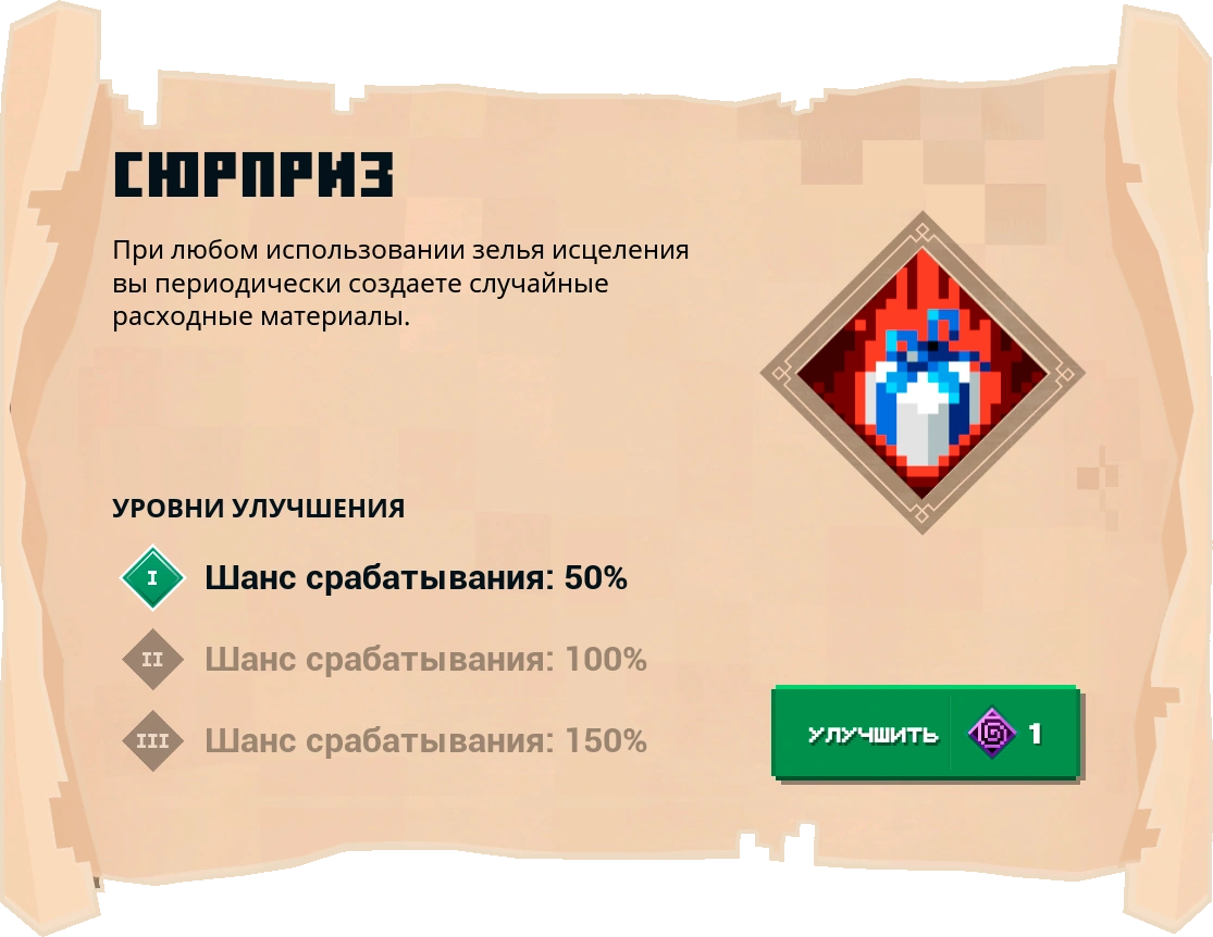 Сюрприз (англ. Surprise Gift) — это чары в Minecraft Dungeons, которые заставляют выпадать расходные материалы (зелье силы,зелье ускорения,теневое зелье, пучок стрел) при использовании лечебного зелья, даже если игрок полностью здоров. Шанс срабатывания увеличивается на 50 % с каждым уровнем. Эти чары сбрасывают только зелья и пучки стрел.