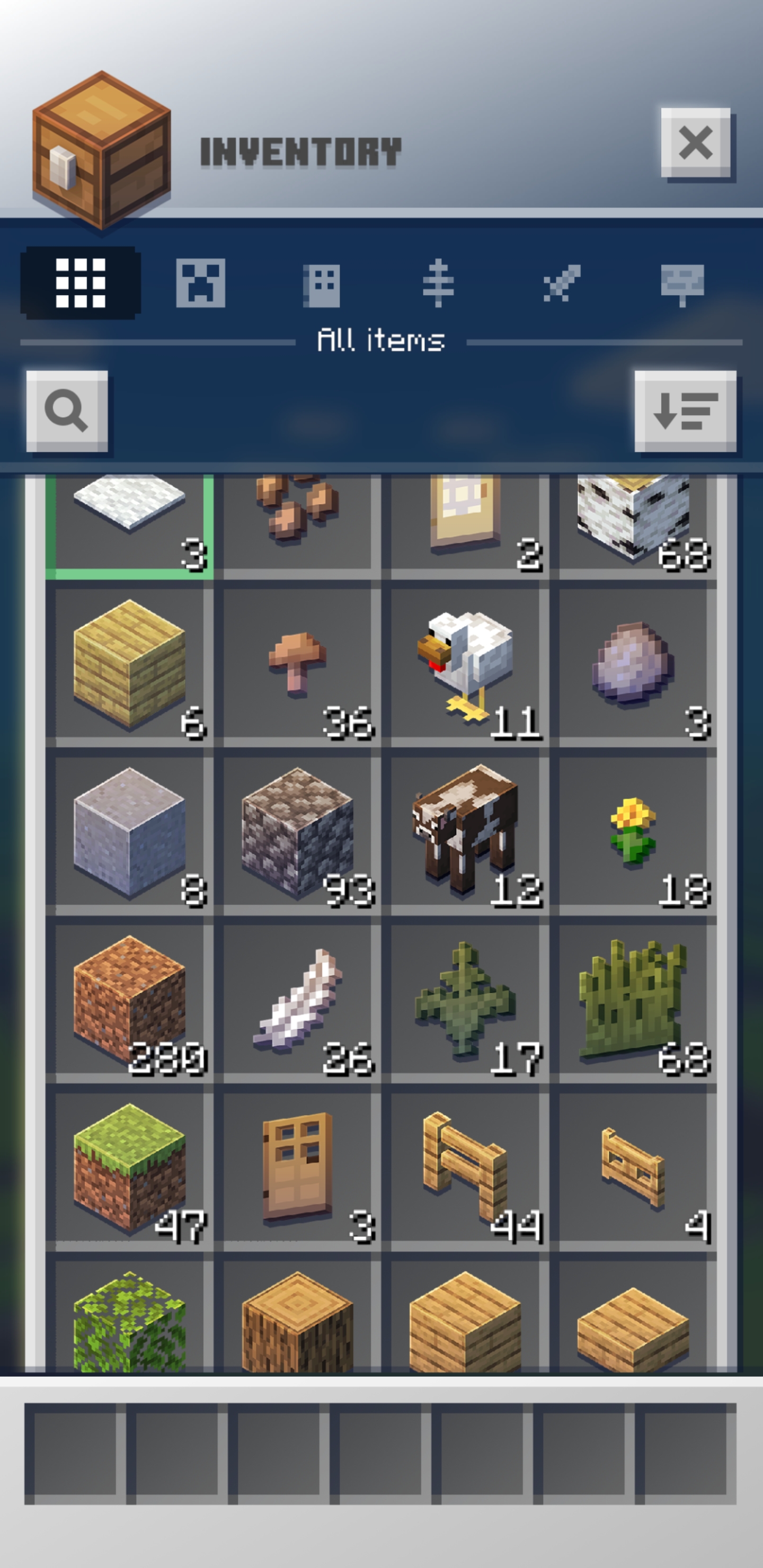 Инвентарь в игре не ограничен как по количеству слотов, так и по количеству блоков или предметов в одной стопке.