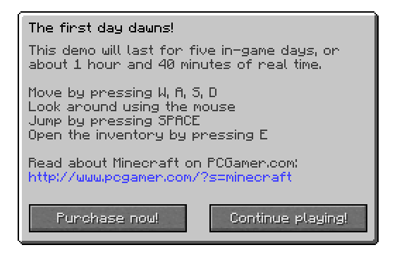 Эта версия представляет собой ограниченую во времени игры версию Beta 1.3. Играть можно только 100 минут, то есть 5 игровых суток. После этого блоки перестанут ставиться, разрушаться (будут как коренная порода), поджигаться, мобов нельзя будет ударить, а также всячески взаимодействовать с игровым миром.