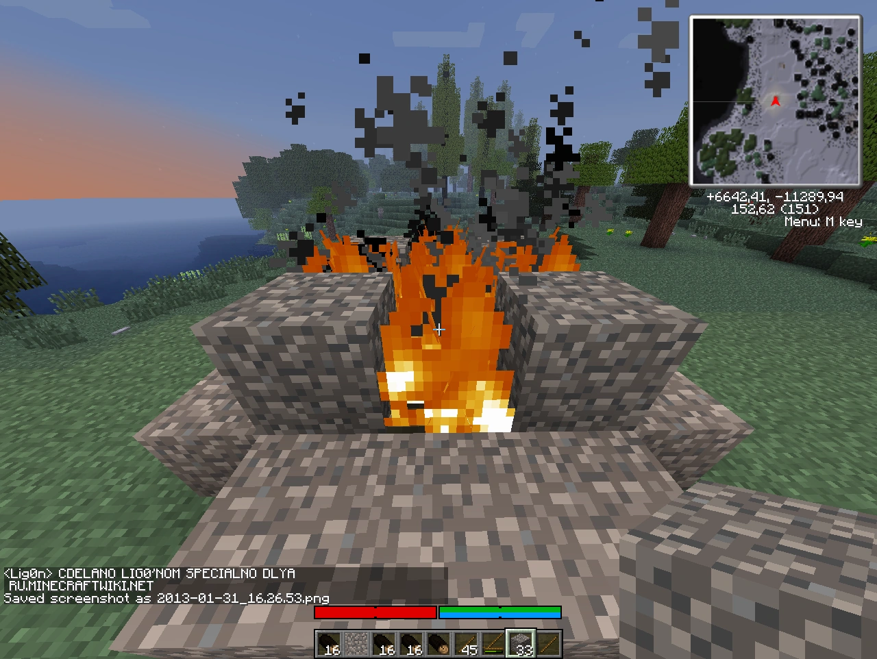 Окружаем кладку негорючими блоками и ставим внутрь костёр (для версий 0,79 и выше кидаем внутрь факел).
