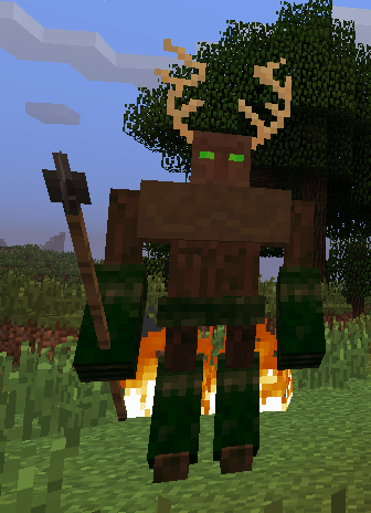 Чтобы призвать рогатого охотника, нужно сделать идола которые появятся в мире, но только из окровавленных торб и поджечь. Вам потребуется 20 окровавленных торб. Божество пробудится от долгого сна, и вам предстоит нелёгкая битва. Рогатый охотник не горит в лаве, и чары меча на заговор огня будет бесполезным. Рогатый охотник может натравливать на вас волков с эффектом скорости 2 уровня. В ближнем бою он будет бить вас копьём. У игрока должна быть хотя бы железная броня и меч, так как вам придётся сражаться не только с рогатым охотником, но и с волками. Алмазный меч с чарами на добычу даст вам возможность увеличить количество выпадаемых зачарованных книг в 2-4 раза.
