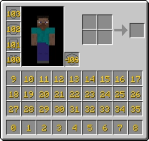 - 27 слотів для зберігання всіх предметів. Зверніть увагу, що ефективність броні з'являється при розташуванні у відповідних слотах — слоти для зберігання предметів не нададуть відчутного результату.