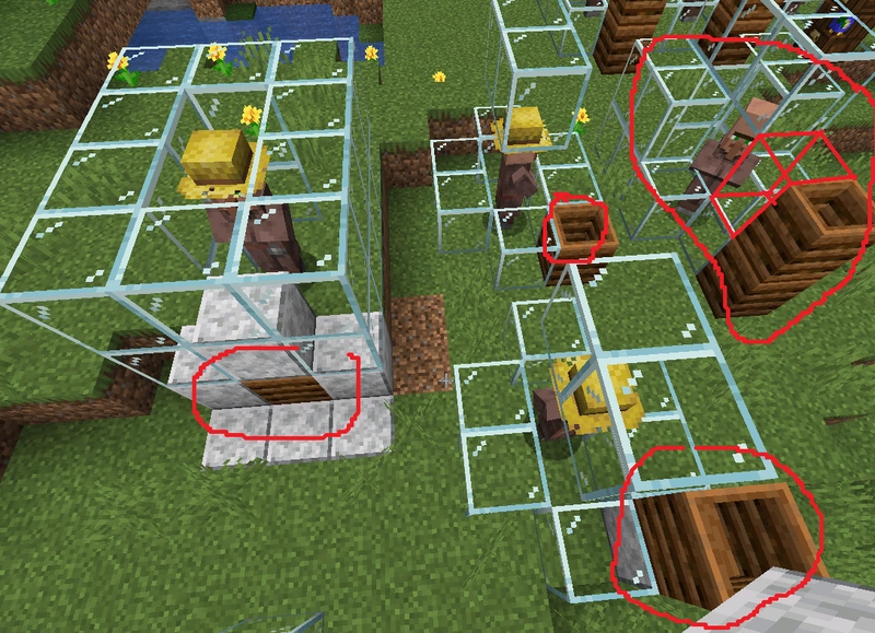 Селяни вміють взаємодіяти з дерев’яними дверима, під час входу і виходу зі своїх будинків. Таким чином вночі, в дощ, грозу, снігопад або рятуючись від зомбі, вони замикаються в своїх будинках. Селяни відкривають двері тільки для того, щоб пройти самому (при цьому не чекаючи інших) і закривають її відразу після того, як пройдуть. Через це можлива ситуація, за якої кілька селян скупчуються біля дверей та через тисняву не можуть зайти в двері.