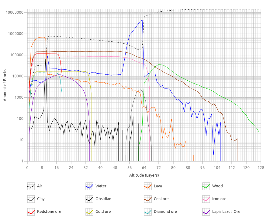 - ↑ Redstone has the same layer and line-size statistics as Diamond, but is generated 8 times per chunk as opposed to 1.