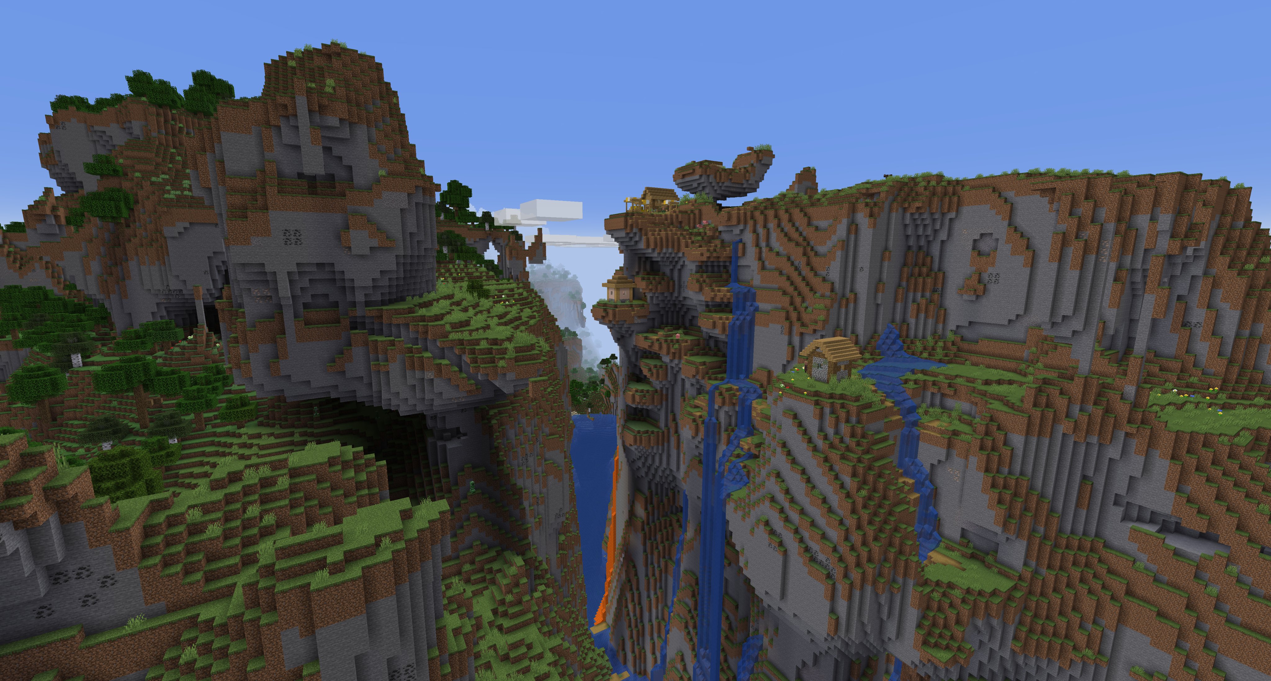 Amplified worlds generate as many large hills and mountains, which dwarf even the mountains biomes seen in default world types, and more often than not reach the world height limit. Deep caverns often reach down to the bedrock layer. Due to extremely steep cliffs and unforgiving terrain, careless players can find it quite difficult to survive in this world type. Certain biomes (i.e. oceans and rivers) may see no obvious change in height. Villages still generate in this world type regardless of how flat the ground is, causing the buildings to generate in bizarre ways.