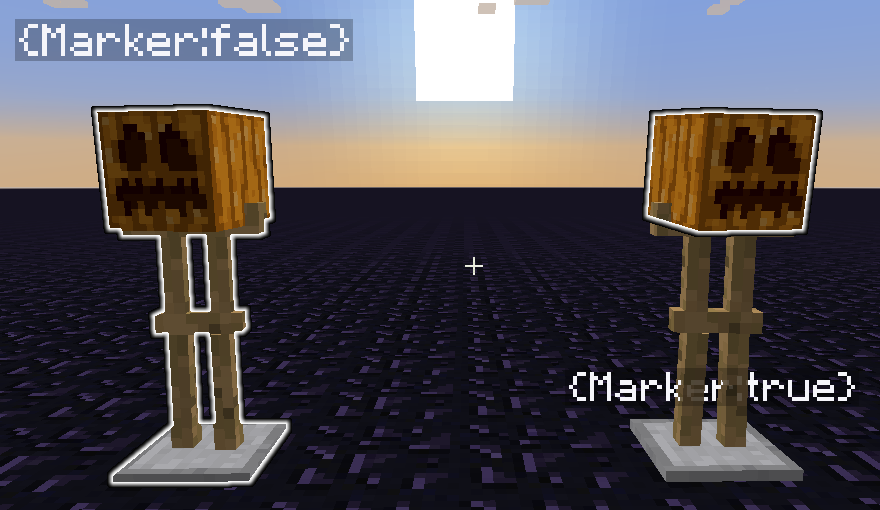 - Marker: 1 or 0 (true/false) - if true, ArmorStand's size is set to 0, has a tiny hitbox, and disables interactions with it. May not exist.