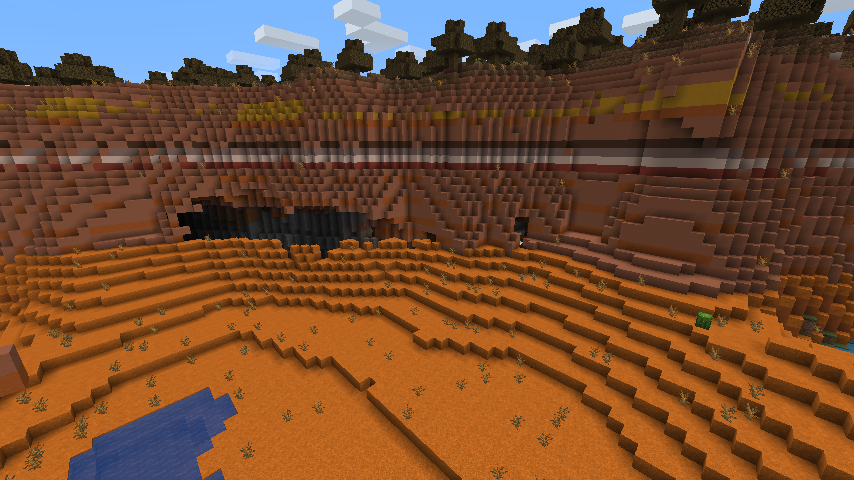 Badlands biomes feature large mounds of terracotta bands, in layers of various colors; specifically, red, orange, yellow, white, light gray, brown, and regular terracotta may all naturally generate. At high altitudes, the topmost layer of stained terracotta is often weathered into regular terracotta, most often on plateau tops. At low altitudes, the terrain surface is weathered into a layer of red sand (or red sandstone if floating), with orange terracotta under it extending to Y=63. The underwater surface is covered with a layer of orange terracotta, and in shallow water, sometimes interspersed with some white terracotta; in deep water, sometimes interspersed with some gravel.