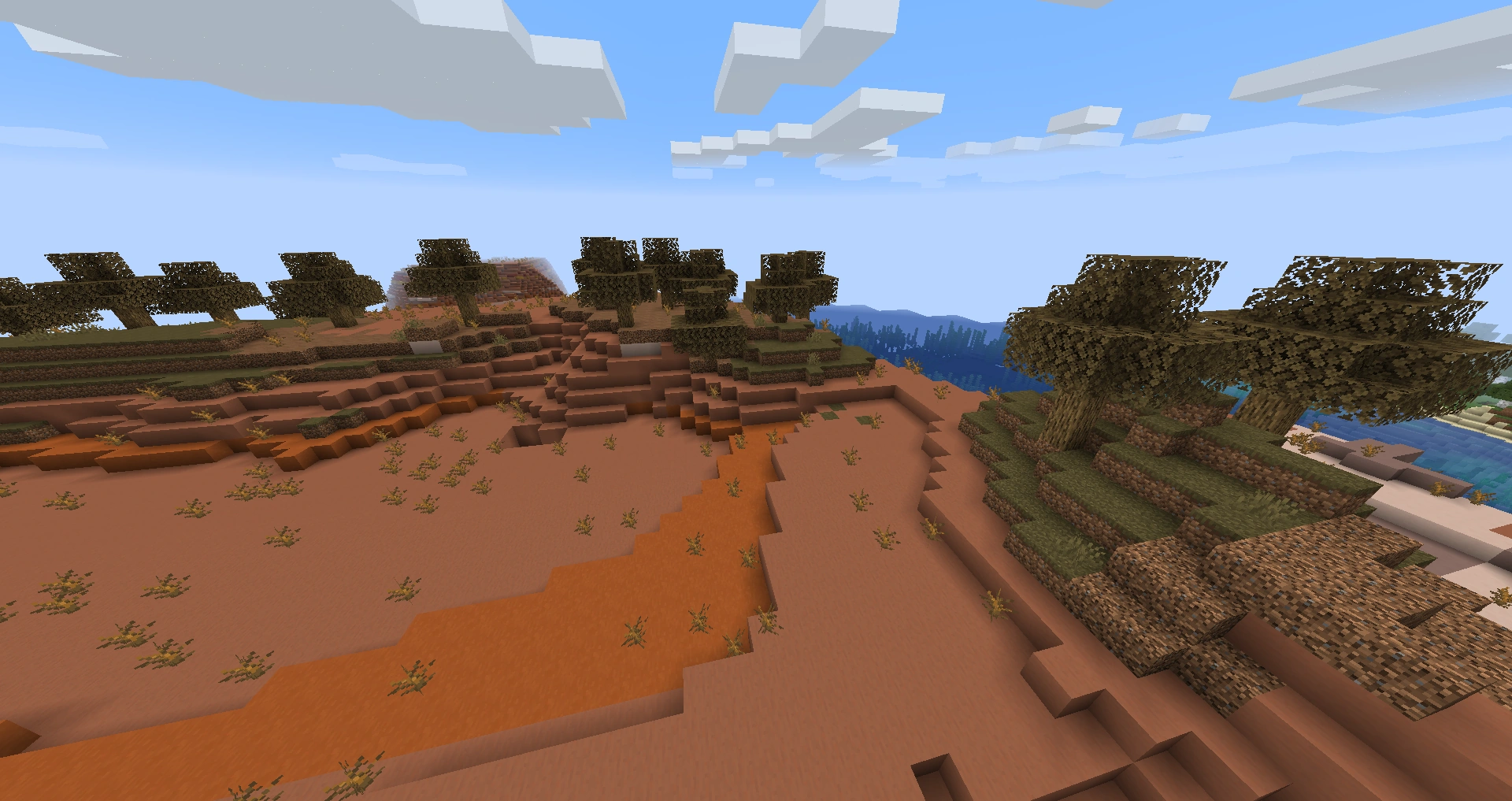 The wooded badlands plateau or wooded badlands[upcoming: JE 1.18 & BE 1.18.0] generates similarly to the regular badlands plateau, but features small groves of trees on its top. The uppermost layers of terrain have large patches of grass and coarse dirt, with oak trees growing on them. Here, the grass and oak leaves take on a dull greenish-brown color darker than that of the Savanna biome, giving it a droughted appearance; additionally, all naturally generated trees are small variants. This variant is a rare source of wood in the otherwise barren badlands. The forest begins generating above elevations of roughly Y=82, this biome is also always present in badlands biomes.