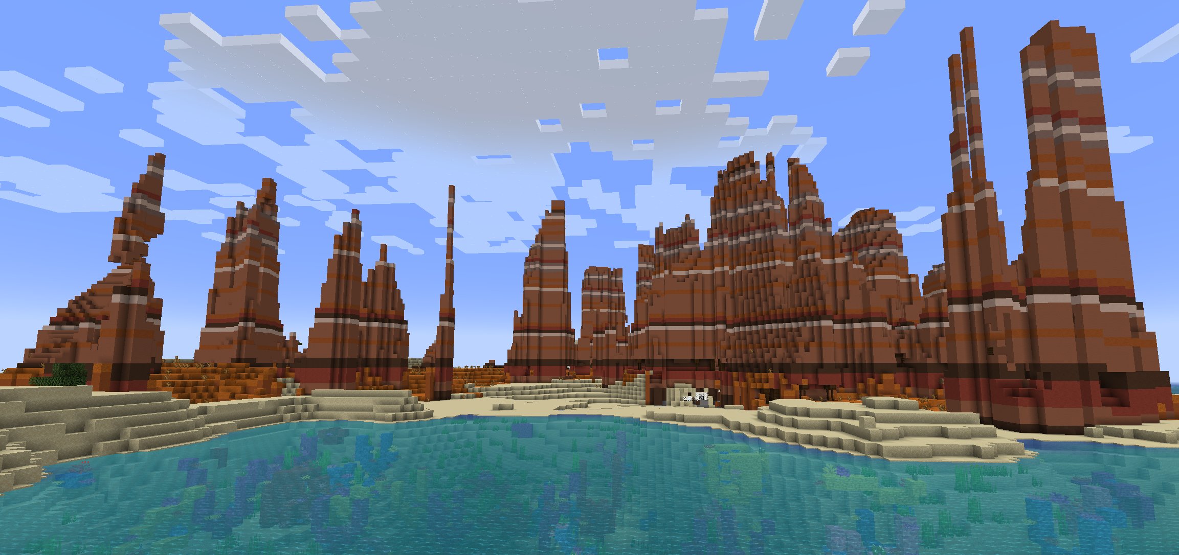 The eroded badlands features unique formations of terracotta hoodoos, narrow spires that rise up from the red sand floor of the biome's drainage basins. This biome is intended to resemble the famous Bryce Canyon in Utah, USA, which features hoodoos across its landscape.