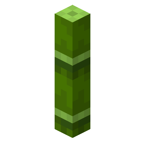 The appearance of bamboo changes as it grows. When first placed, it takes the form of a small shoot. When it grows one block taller it grows to 2 pixels in length and width and the top block has leaves coming off it. At 3 blocks, the top 2 blocks have leaves and at 4 blocks the bamboo expands to 3×3 pixels. At 5 blocks tall, the top 3 blocks have leaves on them. As the bamboo grows, the leaves move up and stay at the top 3 blocks. Destroying a block of bamboo does not change the appearance of the blocks below it. Bamboo is oriented at a random position in the block that it is in. Bamboo, grass, and ferns are the only plants that change their hit boxes as they grow.