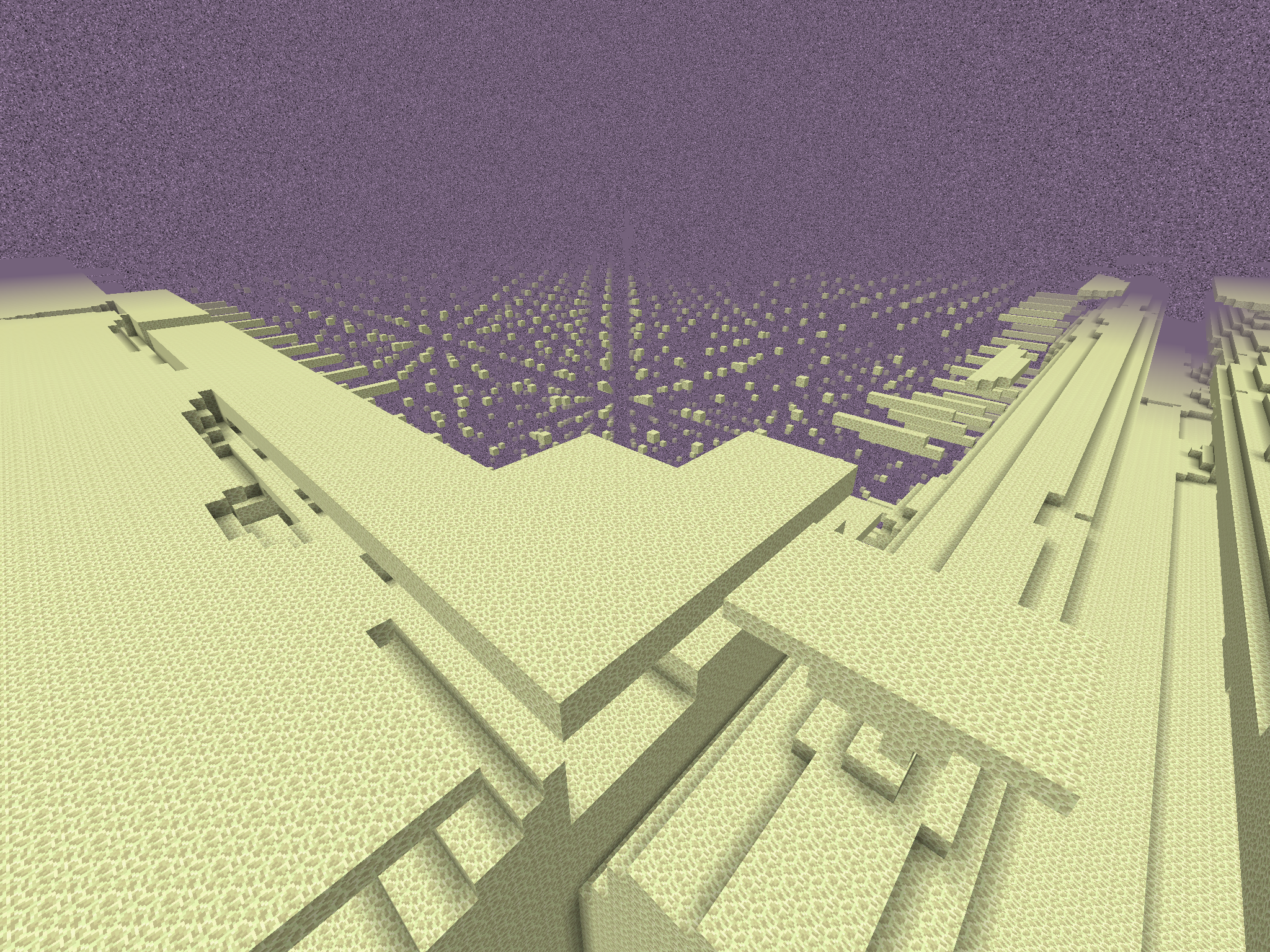 At eighty times the distance of the Fartherer Lands, the selector noise overflows once more, marking the initiation of the Farthest Lands. These are even harder to discern from the regular Far Lands. Again, terrain generation must be manipulated to see these generate.