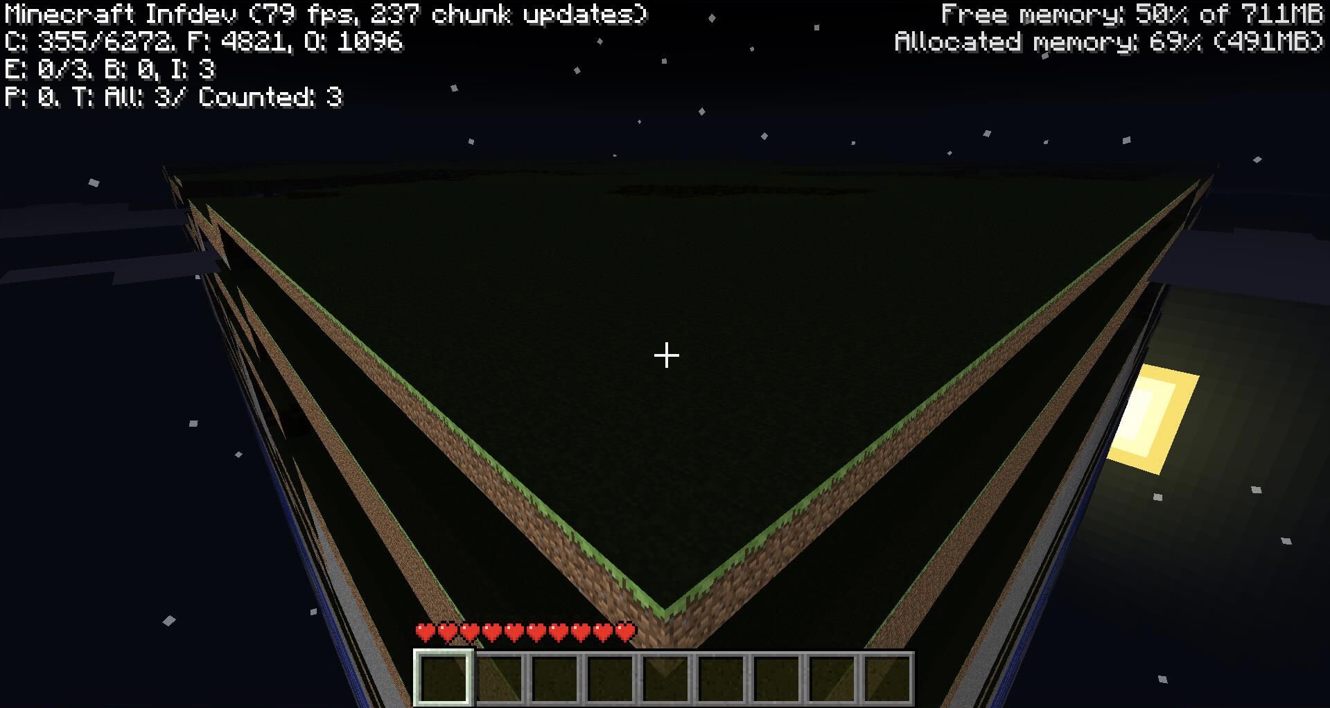 Far Lands at 32,000,000 X/Z in Minecraft Infdev. Blocks do not render beyond X/Z 32,000,000 and if the player tried to walk past here, they would get stuck forever. The "fake chunks" did not appear until Alpha v1.2.0.