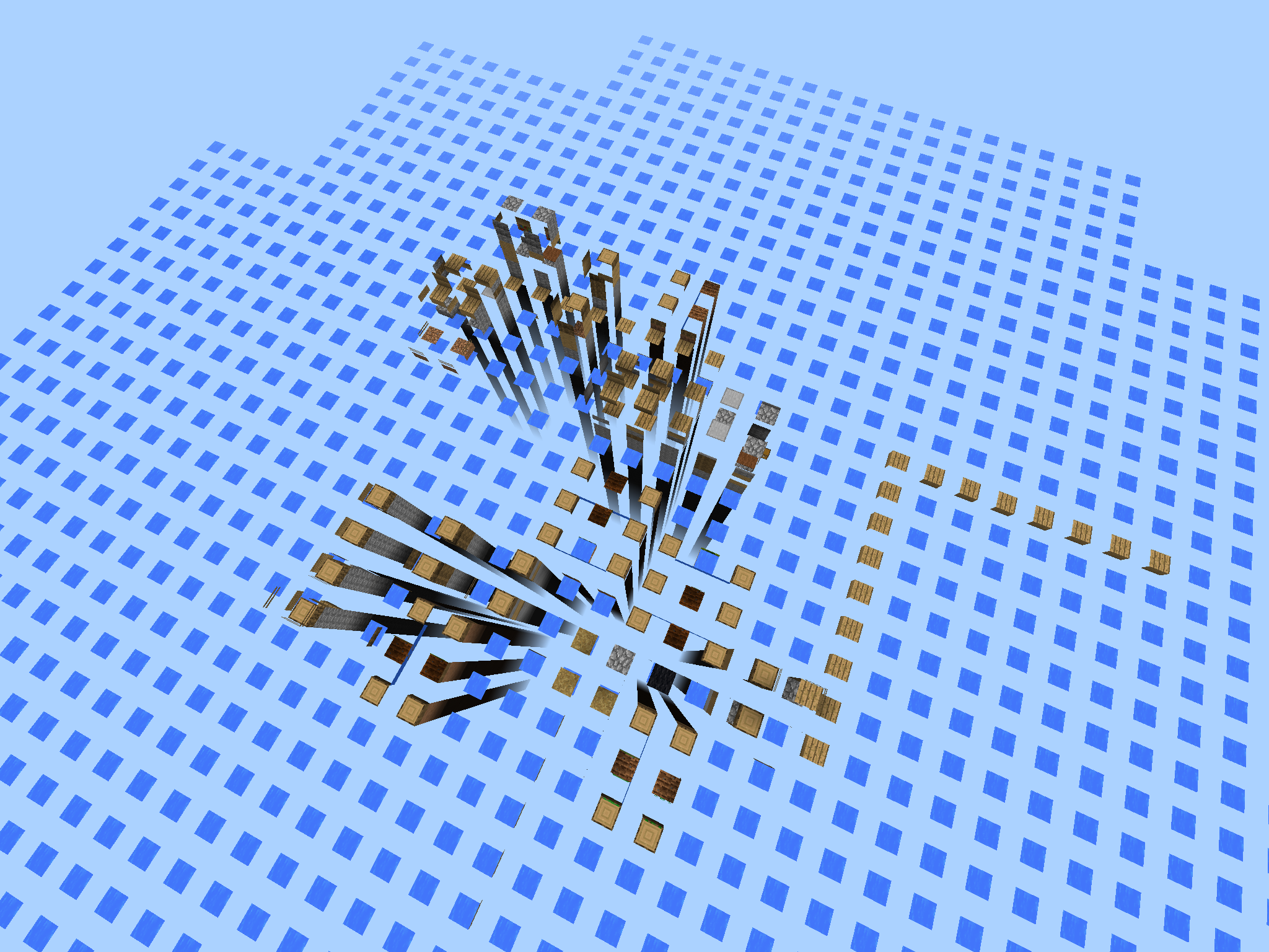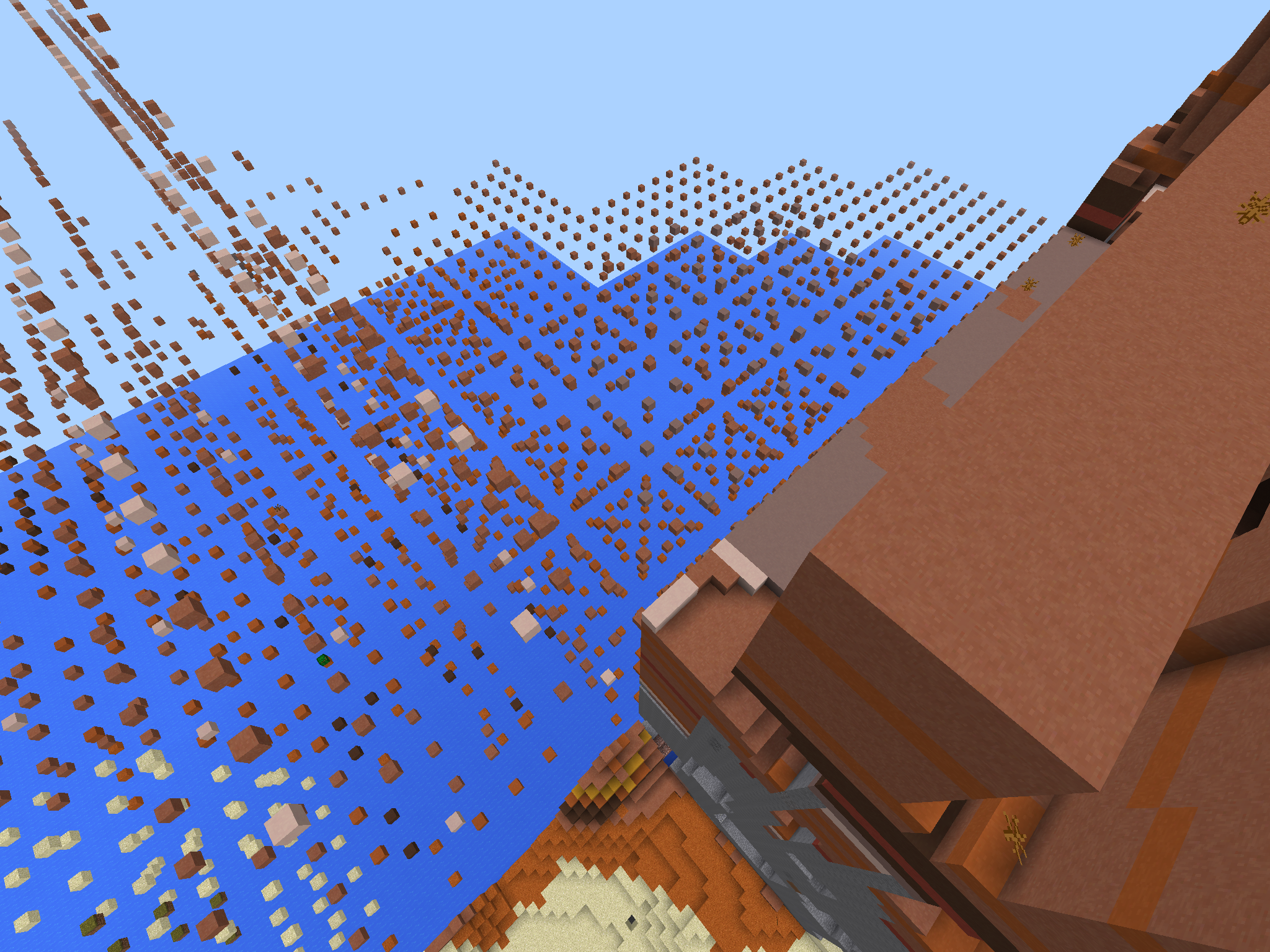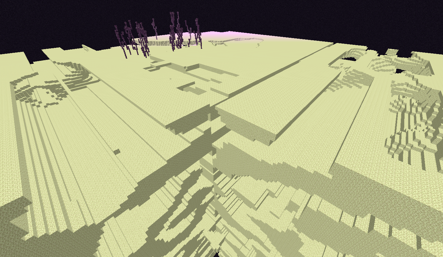 Sometimes, there are extremely tall pillars of gravel that stretch from the ground to the ceiling of a layer. Likewise, some of the beaches that collapse will create pillars of sand all the way down to the ground, despite there not being that much sand, to begin with. The Corner Far Lands is also prone to having near-perfect diagonal lines being carved into the ceilings or floors of layers. If traced, these lines all intersect at the corner (X/Z ±12,550,821). This seems similar to how the Edge Far Lands have a consistent pattern along lines perpendicular to their edge, but is much less pronounced.