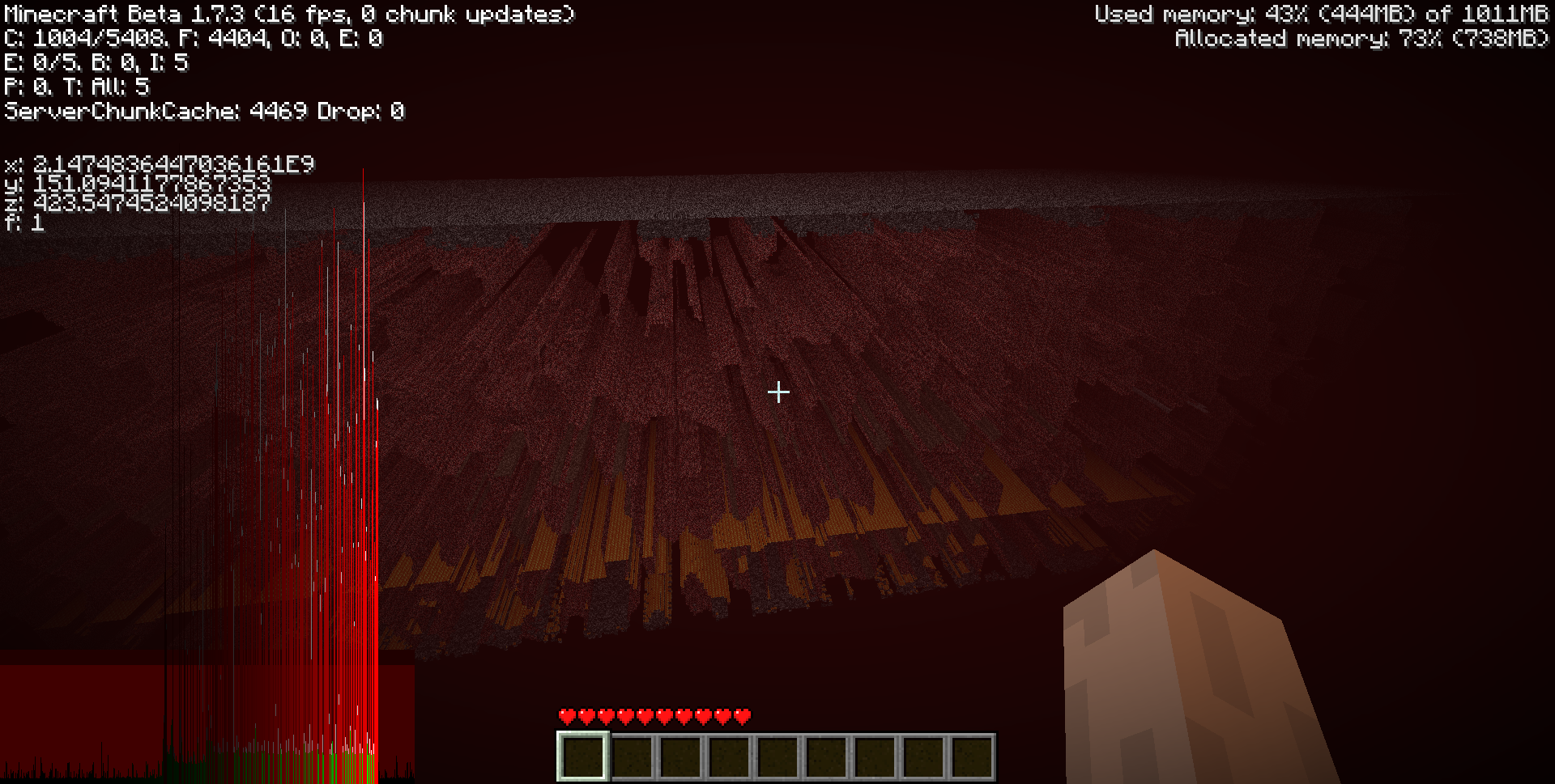 In previous versions of the game, if the player teleported as high as they possibly could, they were sent to a Y-Axis of 3.4x1038. In this zone, the player floats without a purpose, and dropped items will slide with what appears to be no friction before suddenly stopping after about 20 blocks. It has been reported that the X and Z-Axis sometimes flicker randomly in this zone. The memory pie chart also sometimes randomly jumps to 100% undefined memory usage, and then disappears upon re-entering the debug menu.