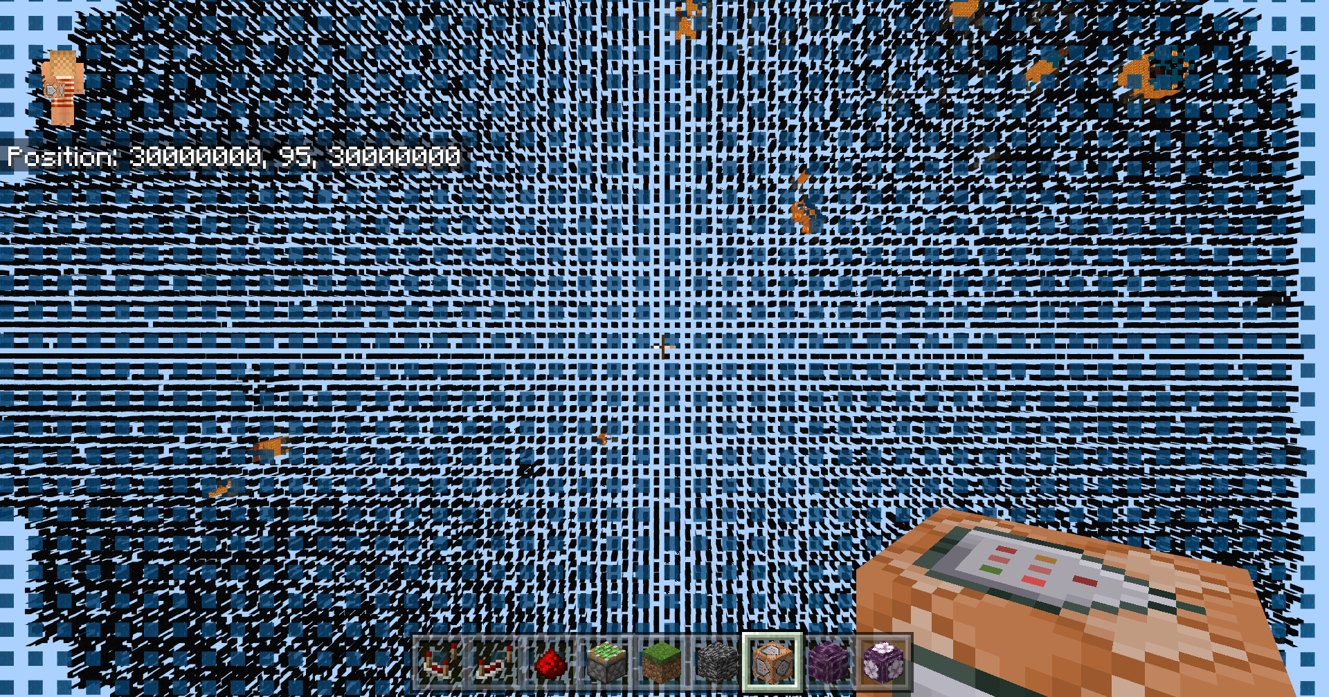 On August 1, 2018, a YouTube user named "Aura Gunner" made a video showing the player teleporting to 1.7 x 10308 on the X-axis.[2] Because 1.7 x 10308 is the maximum number that Java can understand, it caused the player's X coordinate to roll over to read "Infinity". It is impossible to go further since this is the physical limit at which Java can render, and the game will always crash at this distance. It is possible to get this far, however, Cheat Engine must be used to edit the coordinates in a way that allows continuous teleportation.