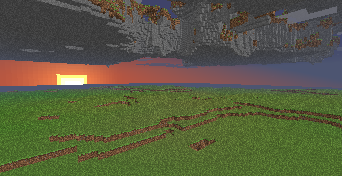 - The dry layers. These generate slightly flatter than normal terrain and have grass, despite the darkness. At sea level massive floating beaches can be found, which will collapse if modified. Hostile mobs are very common here due to being in the shadow of the top layer. Rarely, there are holes in the top layer that allow sunlight to reach these layers. Caves that have one of these layers as their "surface" can occasionally be carved out of dirt instead of stone. These layers have cave-like ceilings made out of stone, gravel and dirt.
