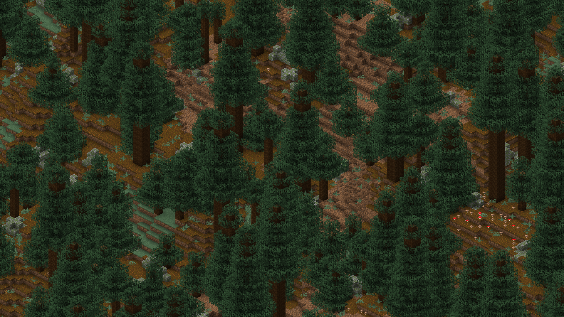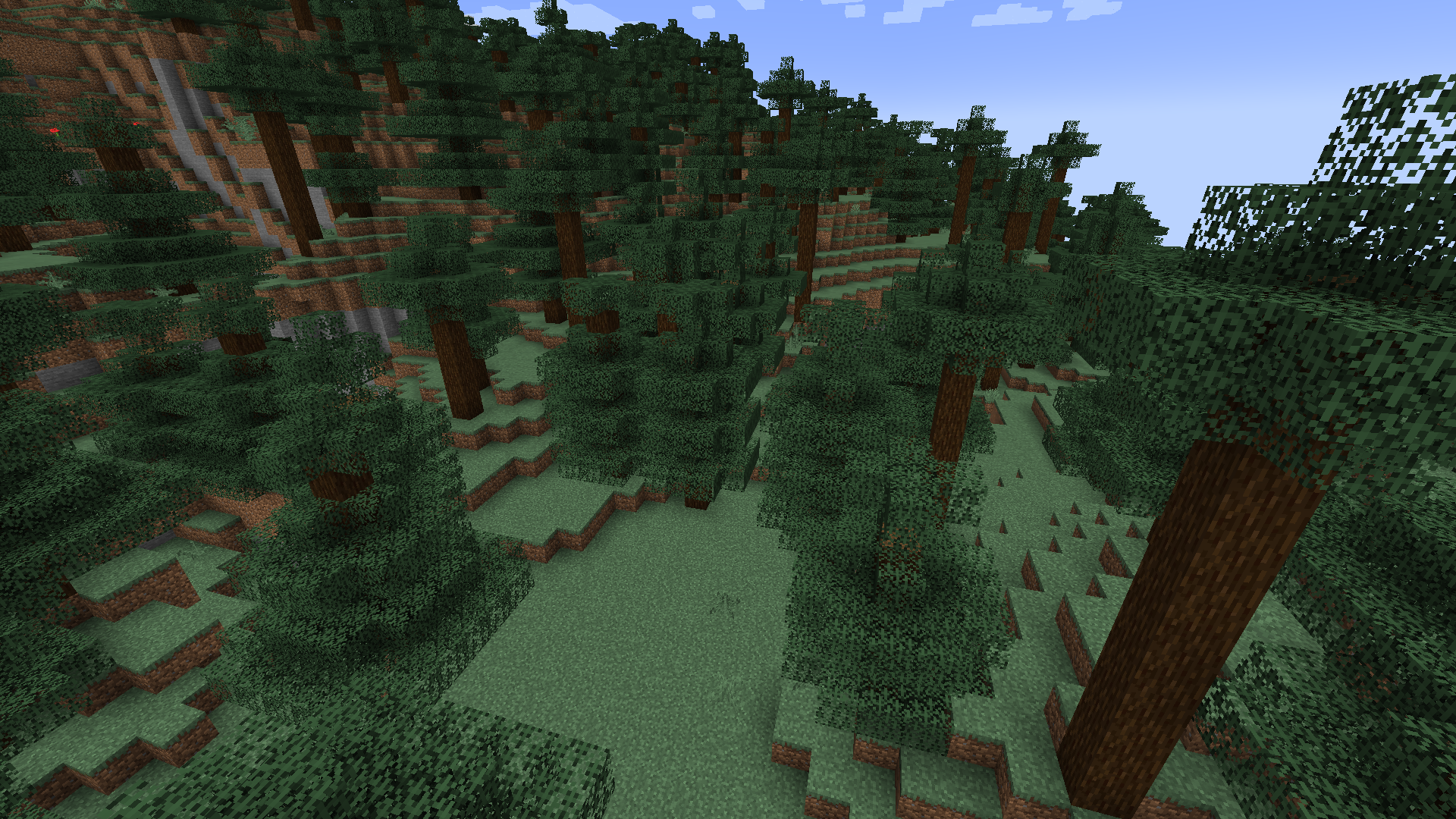 The Taiga Mountains biome also features large spruce forests, but these forests are overlayed onto mountainous terrain. Unlike Taiga Hills, these mountains tend to be larger and more difficult to climb. Perhaps owing to the rough nature of this biome, no villages nor outposts can be found here. |