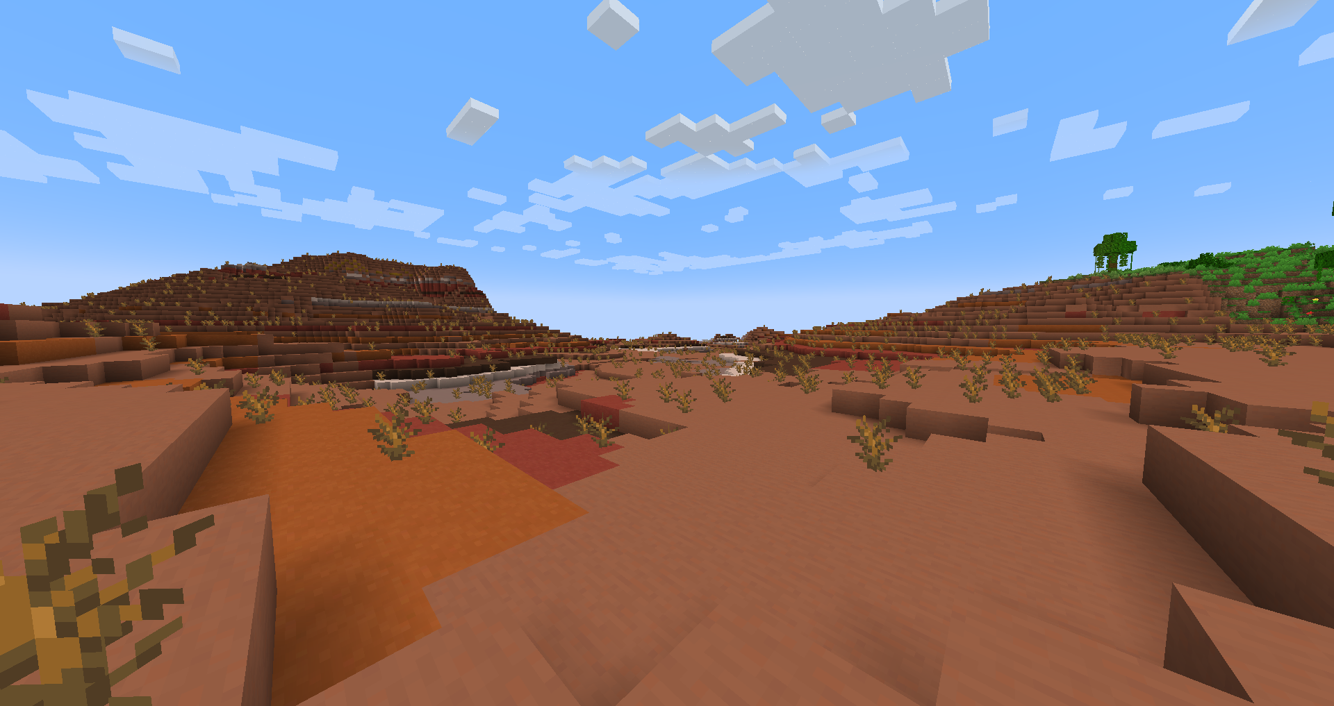 A river running through a badlands plateaus or “Mesa” biome, with a savanna biome in the bottom right.