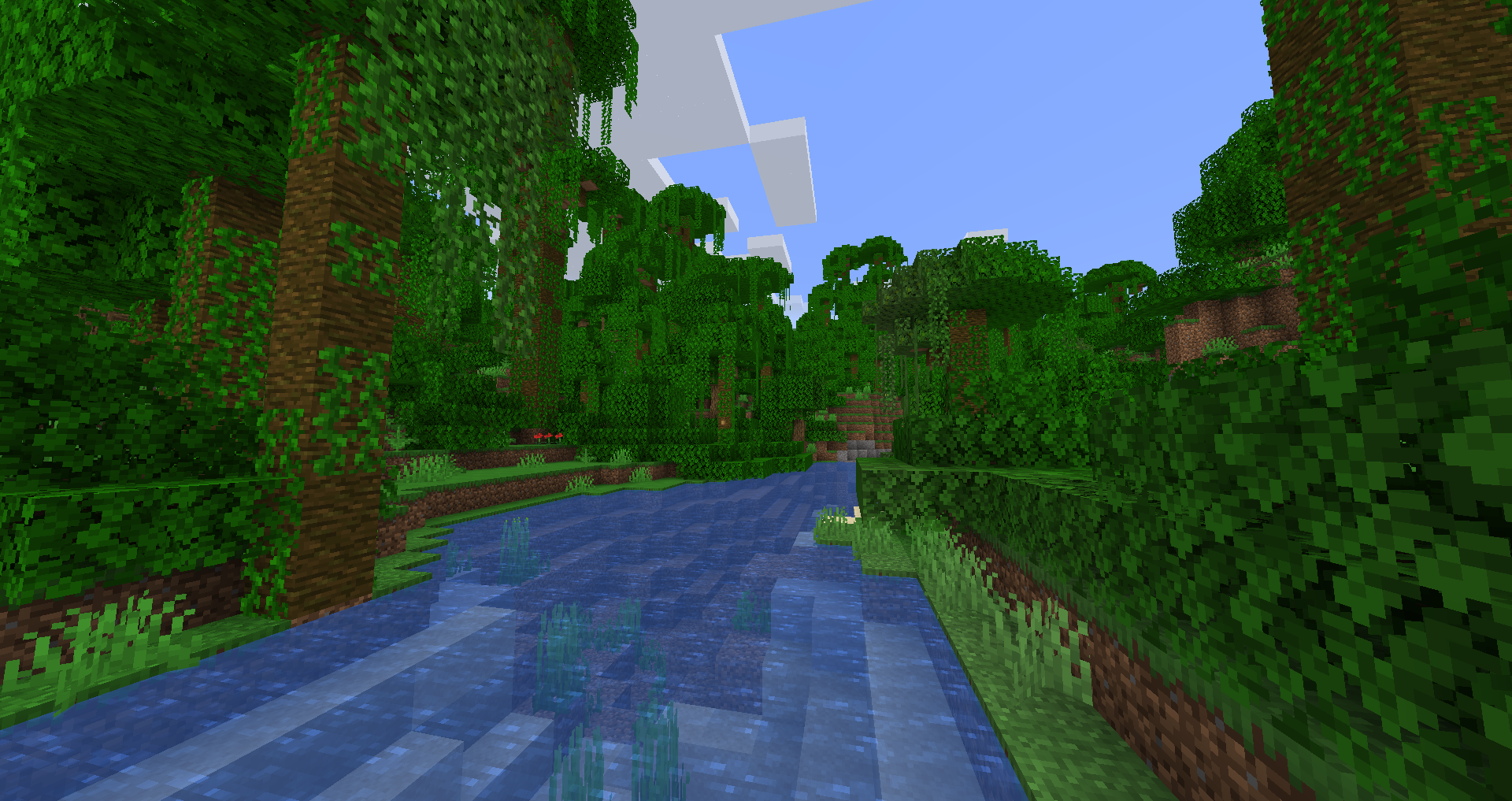 In these verdant biomes, it begins snowing over the 256 block height limit (meaning, snow does not generate naturally). Otherwise, it rains. The foliage and grass is a vibrant light green, except for swamps and dark forests, which have dark green grass. Rivers and birch forests are also exempt from this, as they have a dull aqua green hue. The water is blue in this biome.