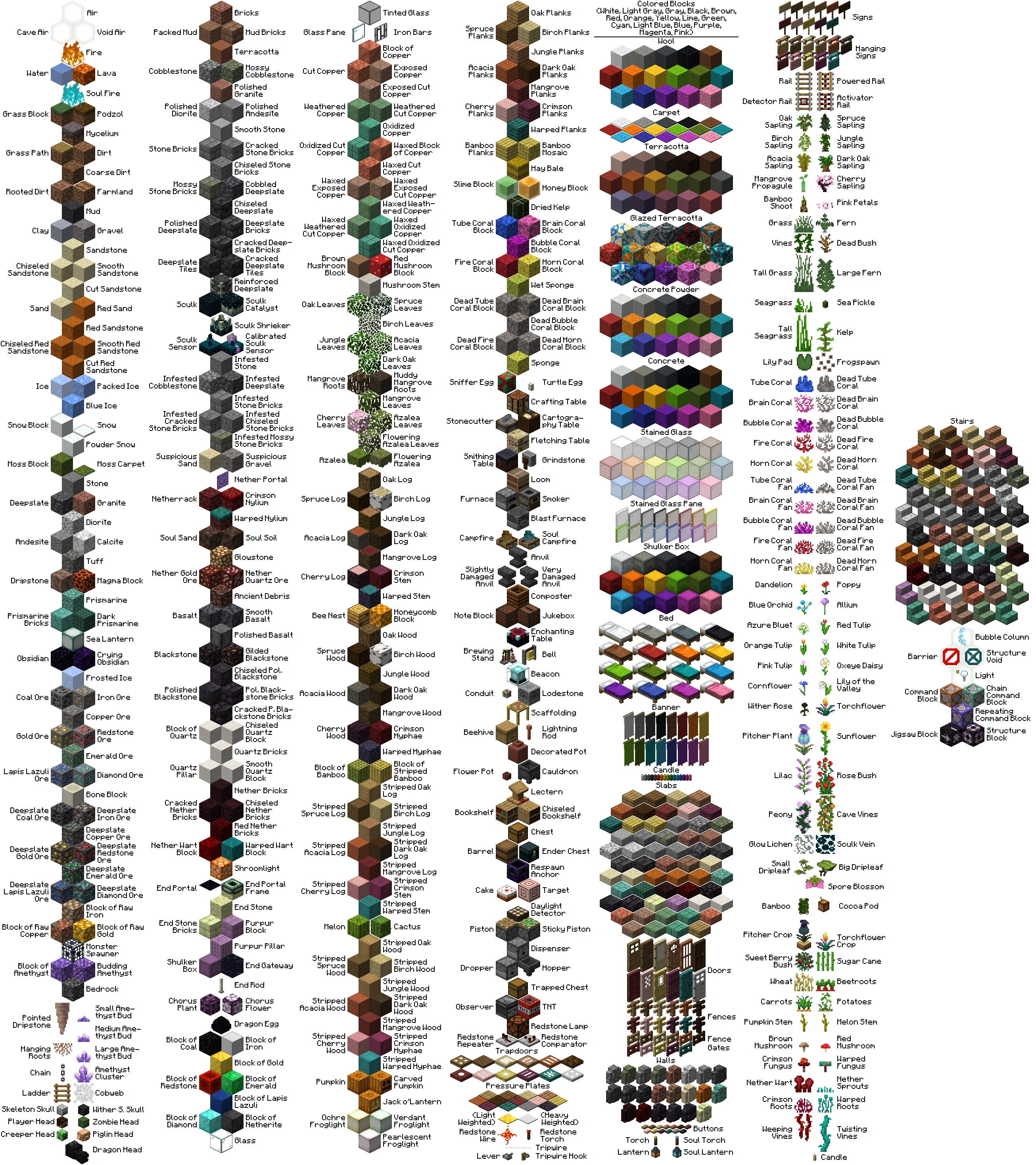 Blocks are arranged in a 3-dimensional grid of 1-cubic-meter cells, although some blocks appear to occupy a partial cell; these include slabs, snow layers, ladders, vines, stairs, turtle eggs, sea pickles, and others.
