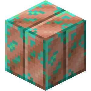 The block of copper and cut copper are blocks that oxidize over time, gaining a verdigris appearance over four stages. They can be prevented from oxidising by being waxed with honeycombs. Non-cut, non-oxidized, non-waxed copper blocks are storage blocks equivalent to nine copper ingots.