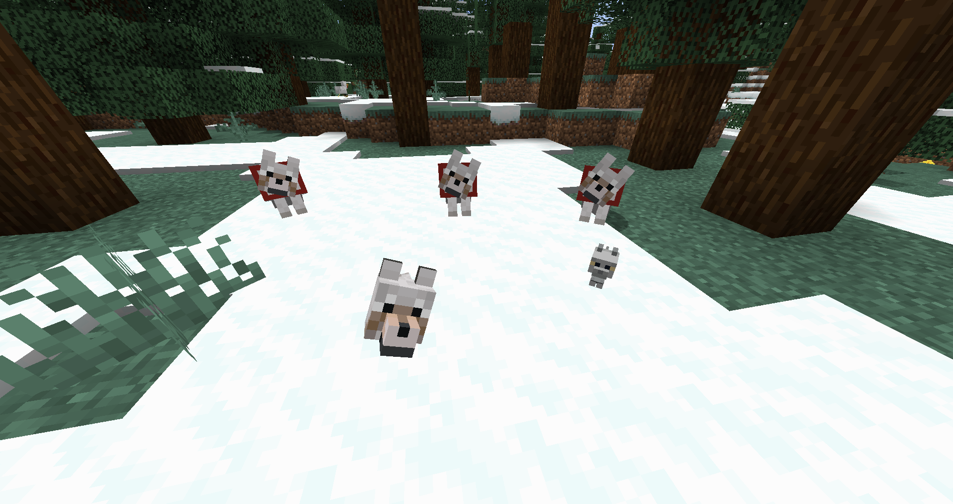 As of 12w04a, Pigs, Sheep, Chickens, Cows and Mooshrooms enter "love mode" if fed one wheat. Wolves enter love mode when they are fed any type of meat. Cats enter love mode when they are fed raw fish. Animals in "love mode" emit hearts constantly and will path towards nearby animals of the same species that are also in love mode.[3] The two animals will "kiss" for about two and a half seconds, and then baby animal of the same species spawns either in between the parents or on the same blocks as one of the parents, which ends love mode for the parents. They will not be able to enter love mode again for five minutes. However, they can be herded with the appropriate material, regardless of age. After the baby animal has spawned, it will follow it's parents for a certain amount of time before growing to full size.