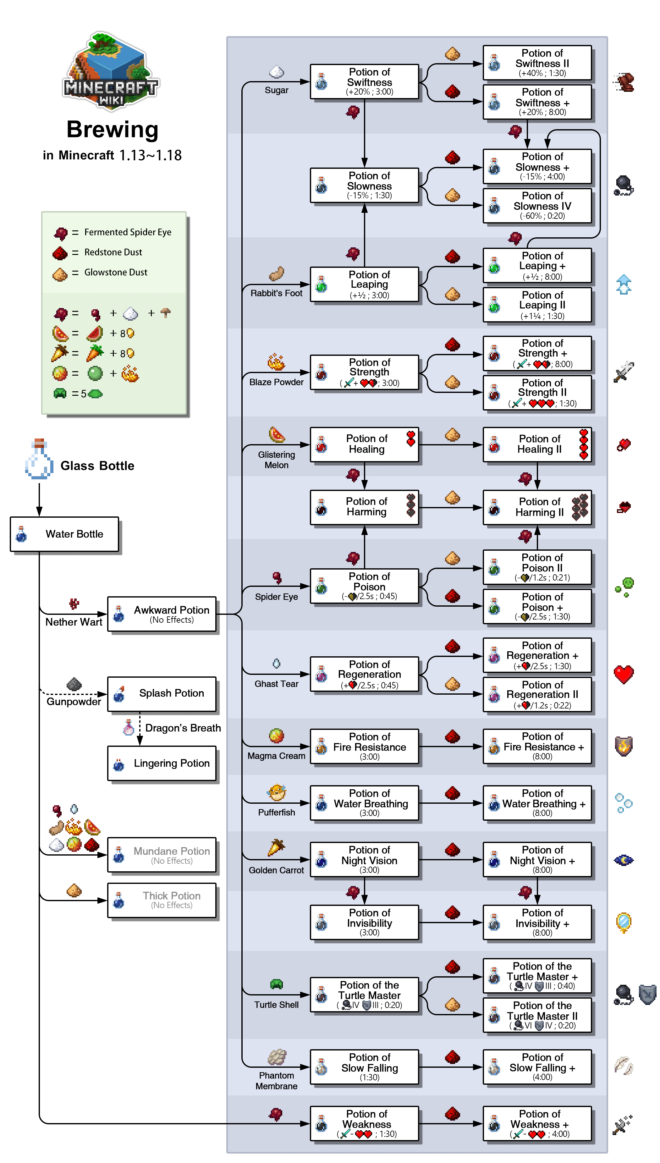 - Upgrading the effect of a potion that has no time parameter (e.g. Instant Health) with glowstone involves no trade-off.