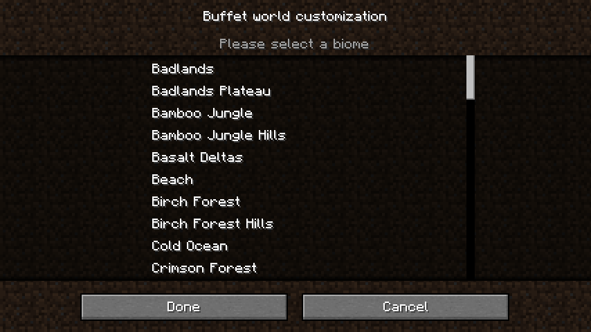 Buffet world types allow the player to choose a biome that the world uses in generating terrain of Overworld. Biome choice determines things such as terrain, vegetation, generated structures (if applicable), and to some extent, mob spawning. Buffet worlds can be customized to use any one of the available biomes and use only that particular biome for the entire world. The player can choose any of the existing biomes, including technical biomes (such as different End island types).